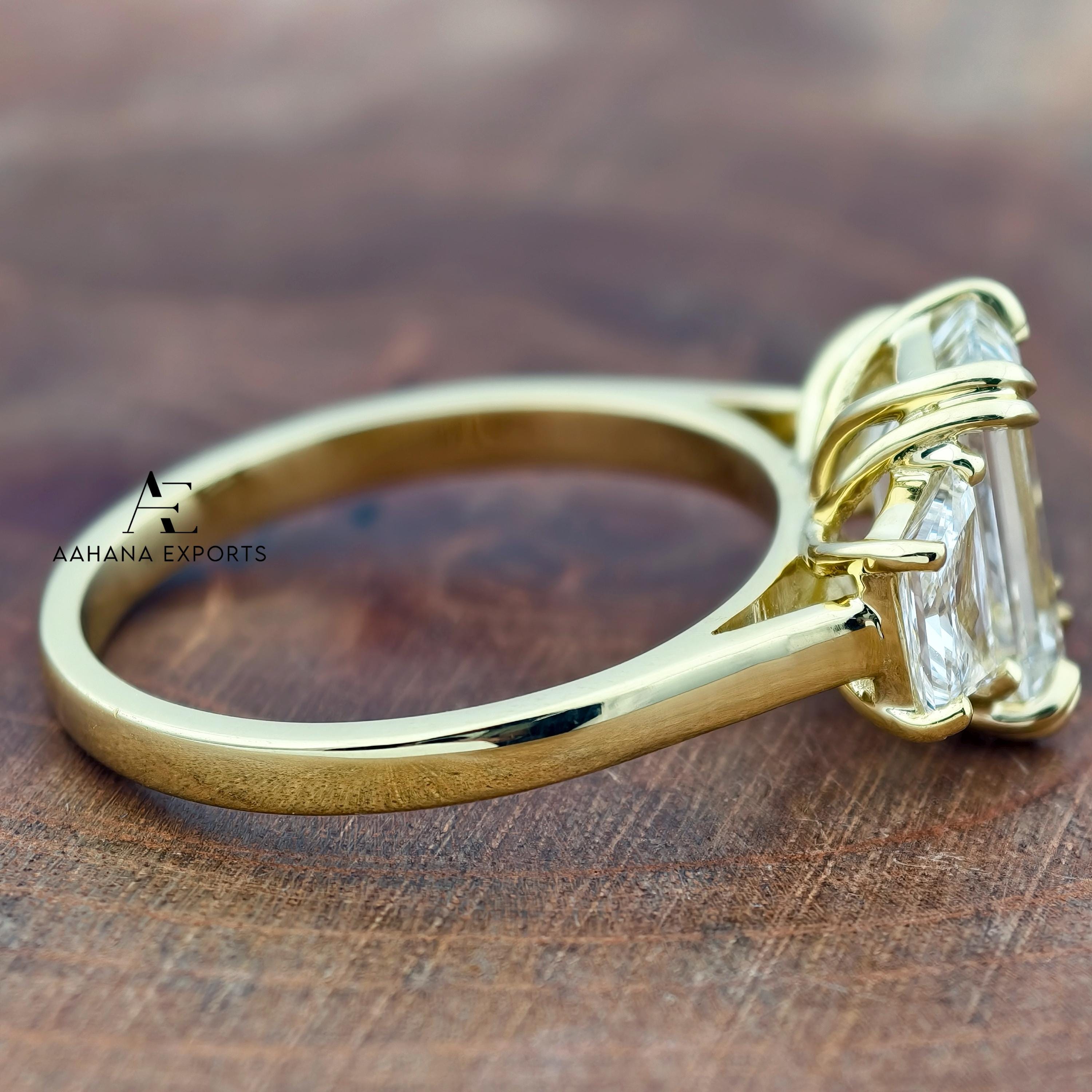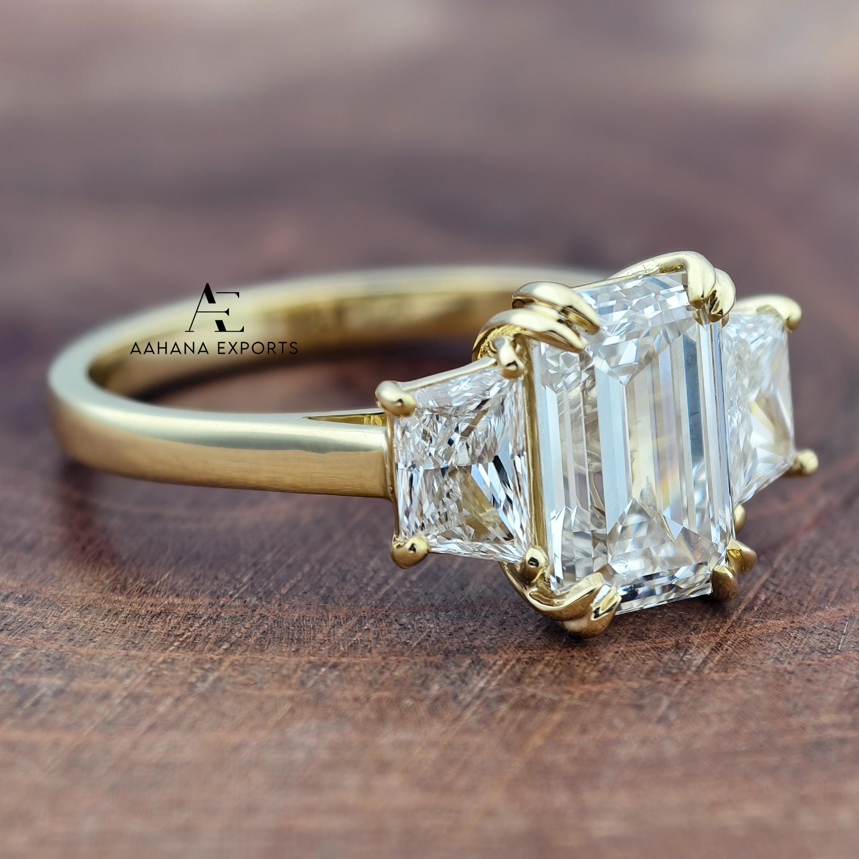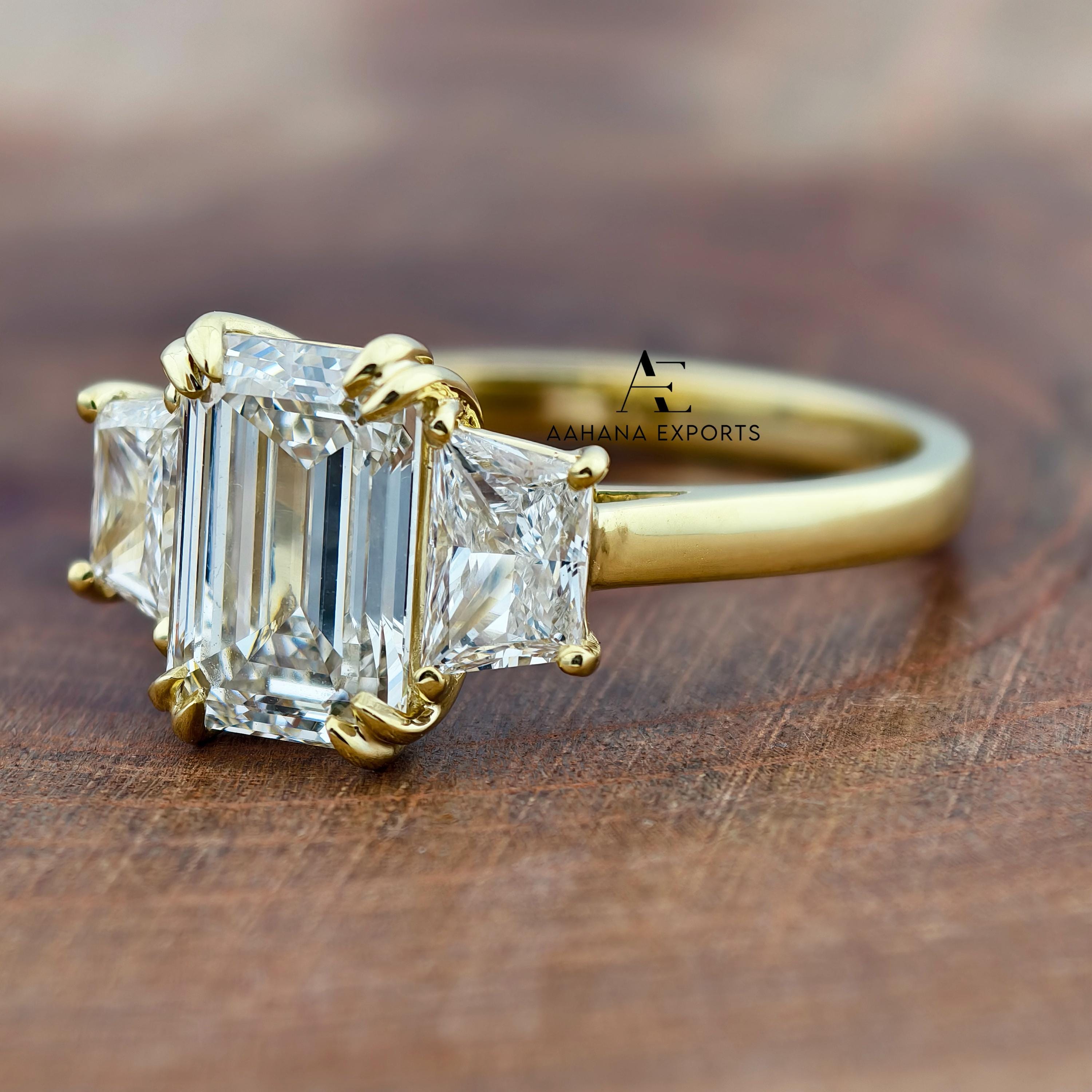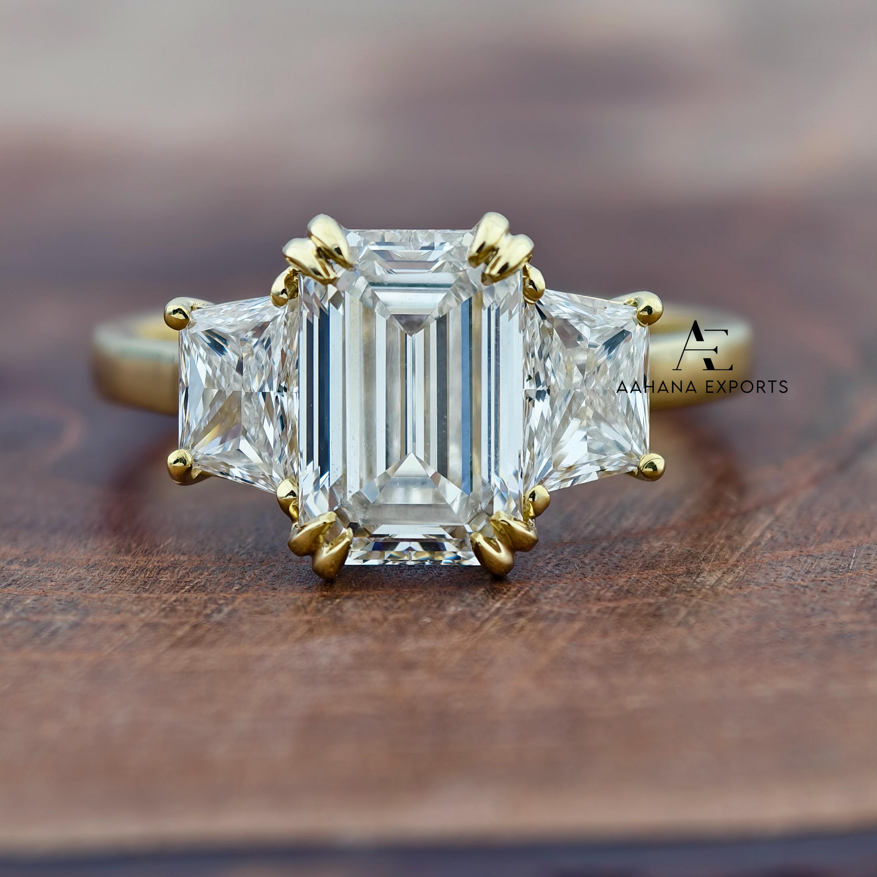 3.00 Carat Lab Grown Emerald Cut Diamond Engagement Ring, Three Stone Ring, Side Brilliant-Cut Trapezoid Diamonds, Handmade in Tulip Setting