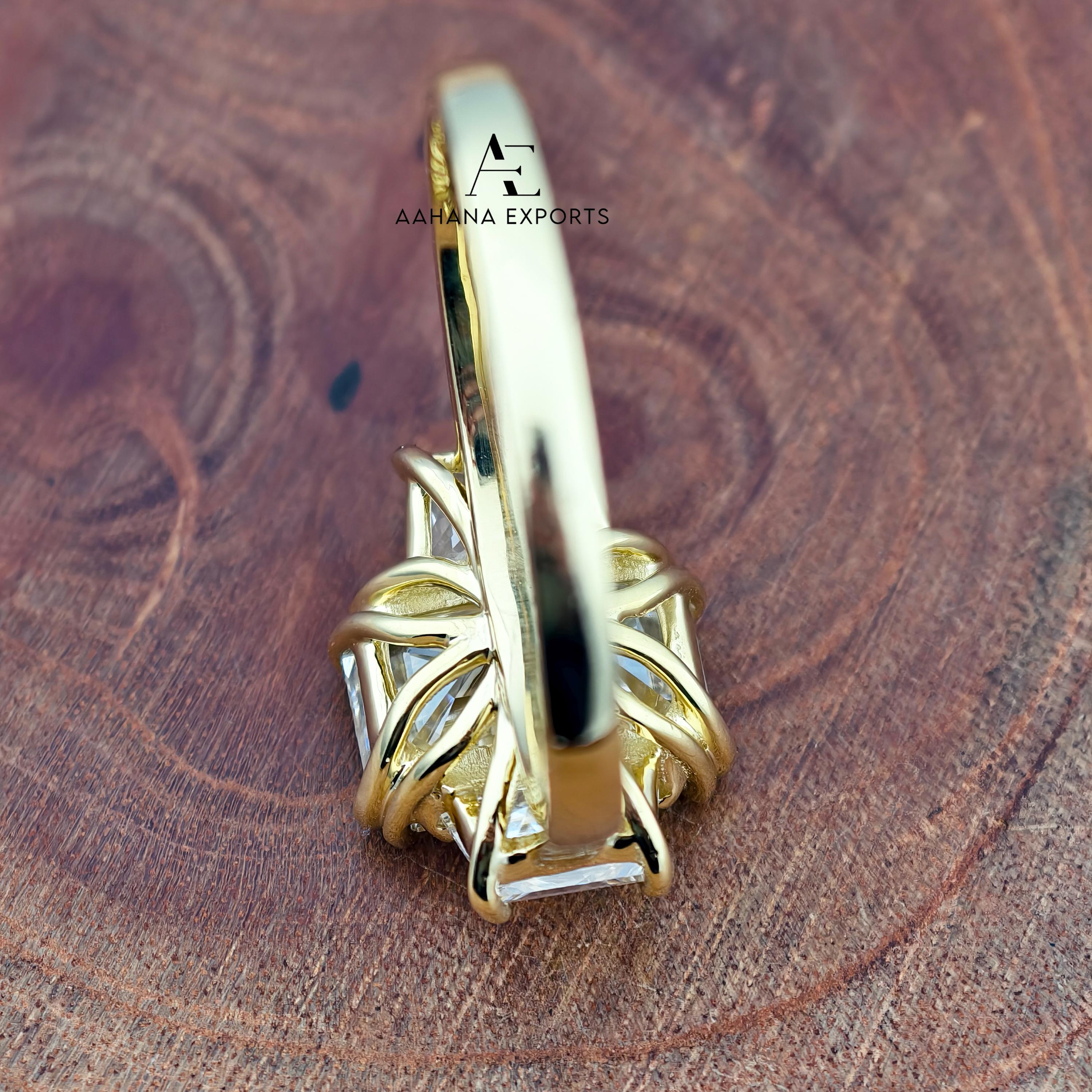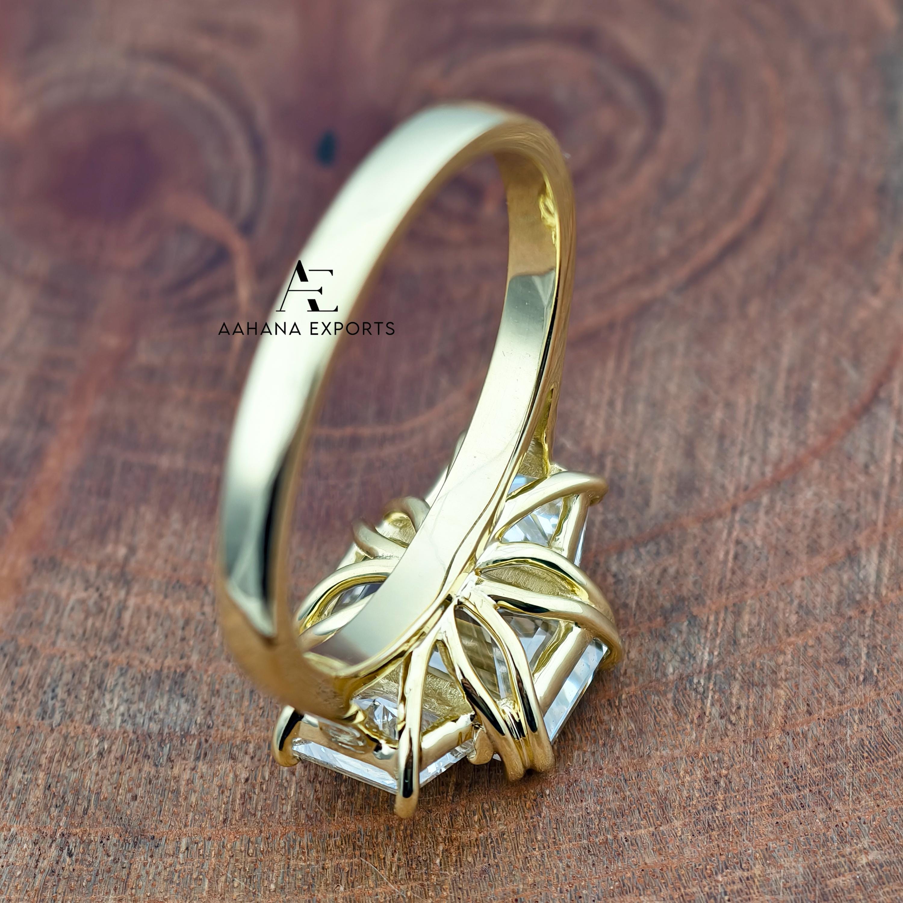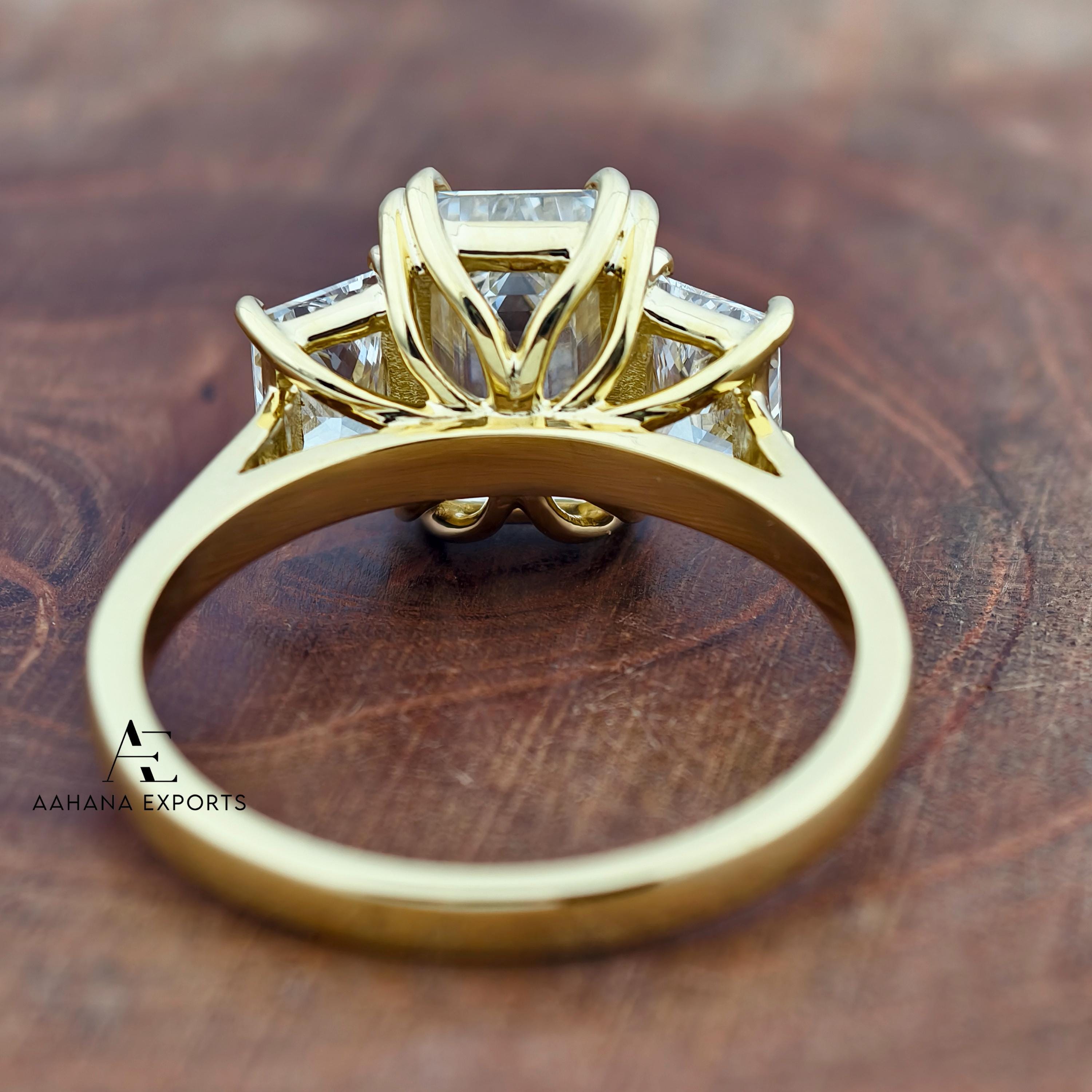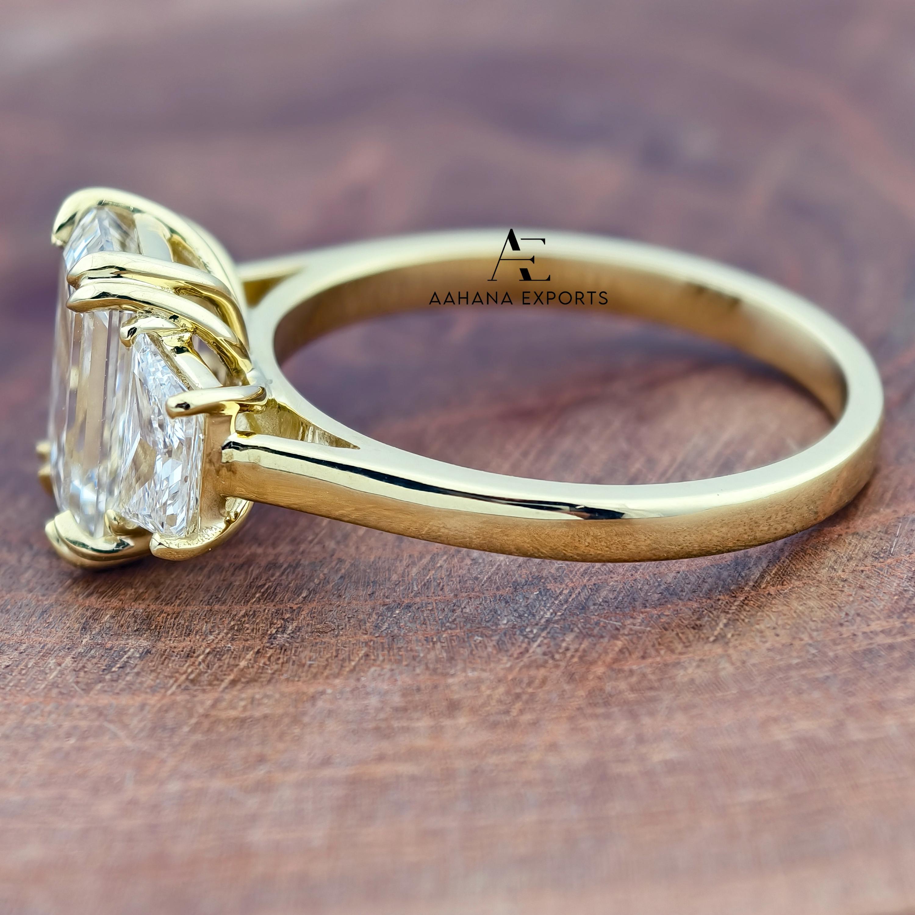 3.00 Carat Lab Grown Emerald Cut Diamond Engagement Ring, Three Stone Ring, Side Brilliant-Cut Trapezoid Diamonds, Handmade in Tulip Setting