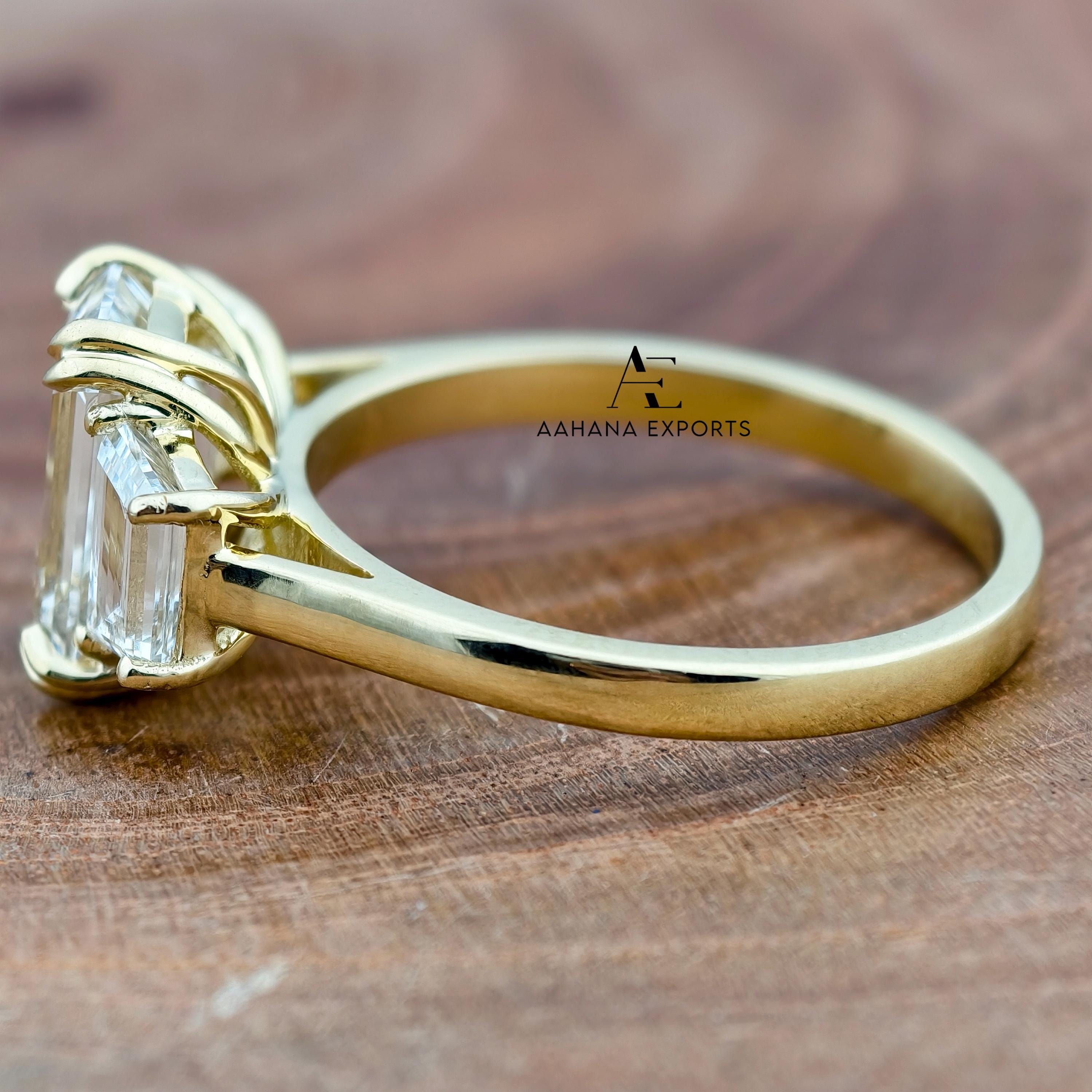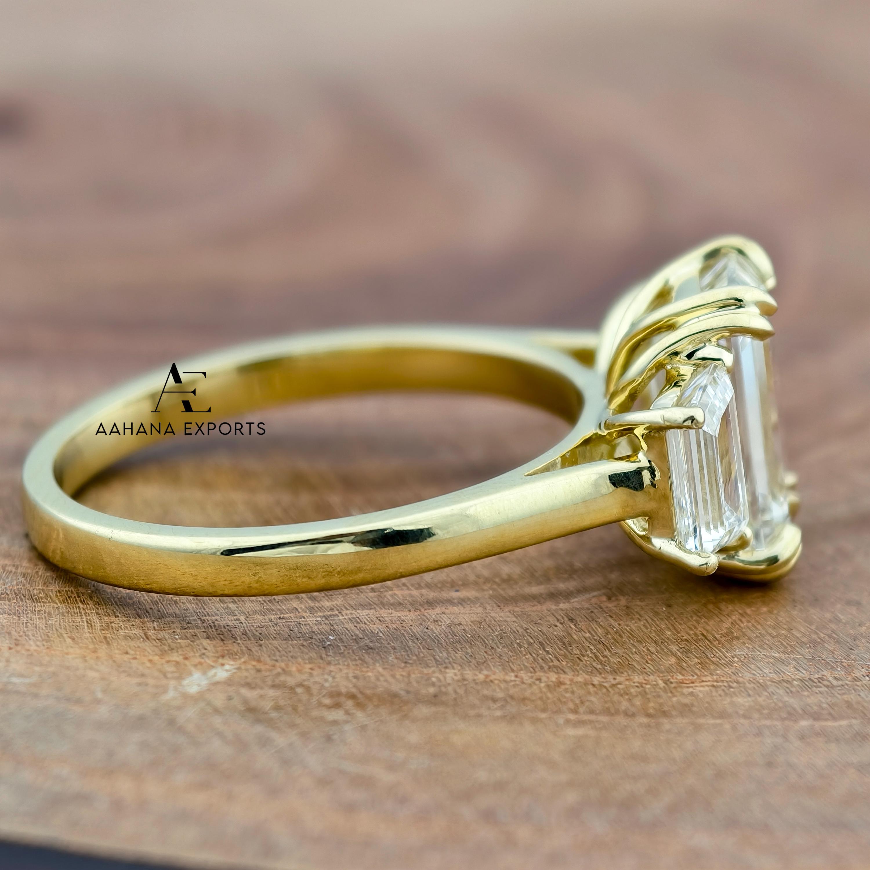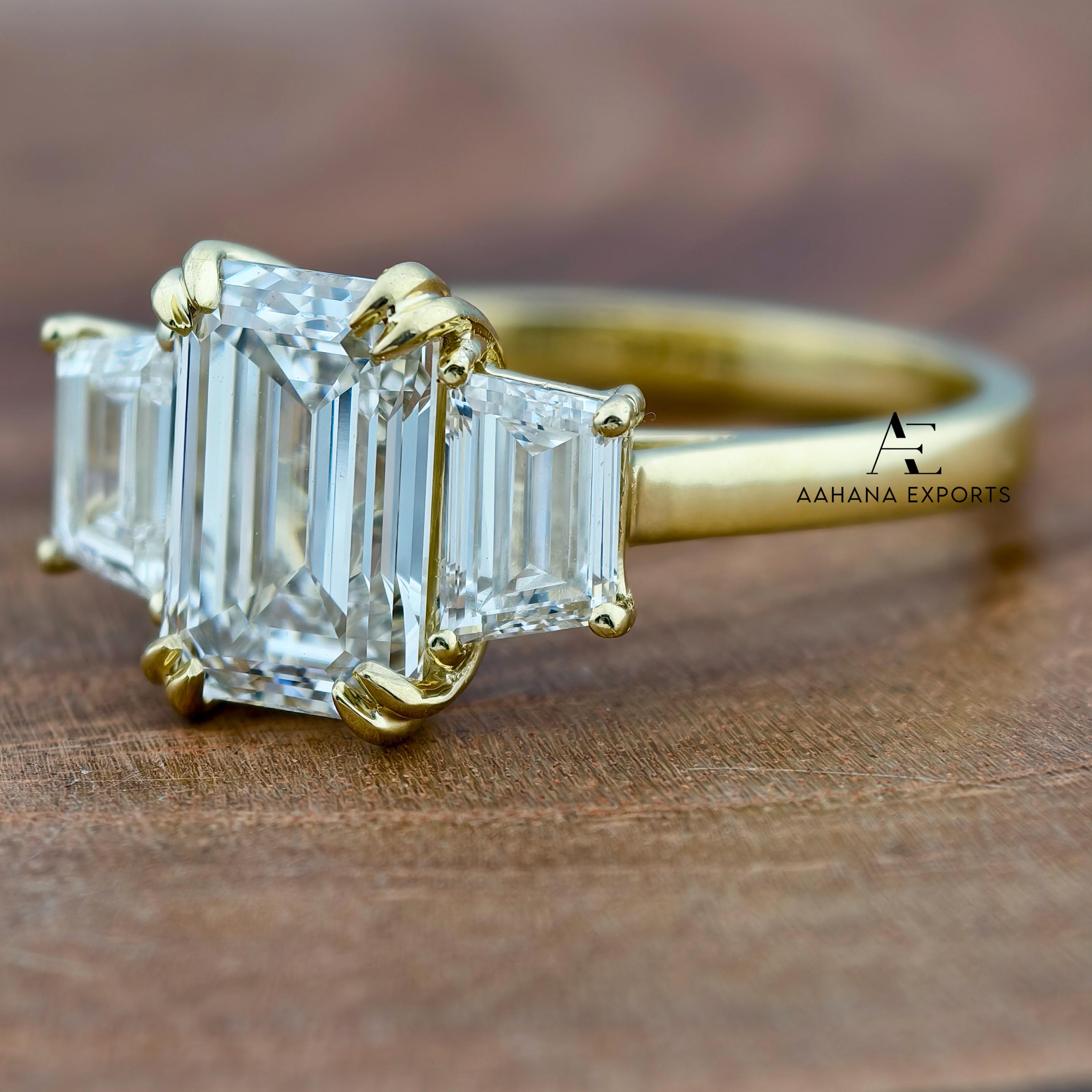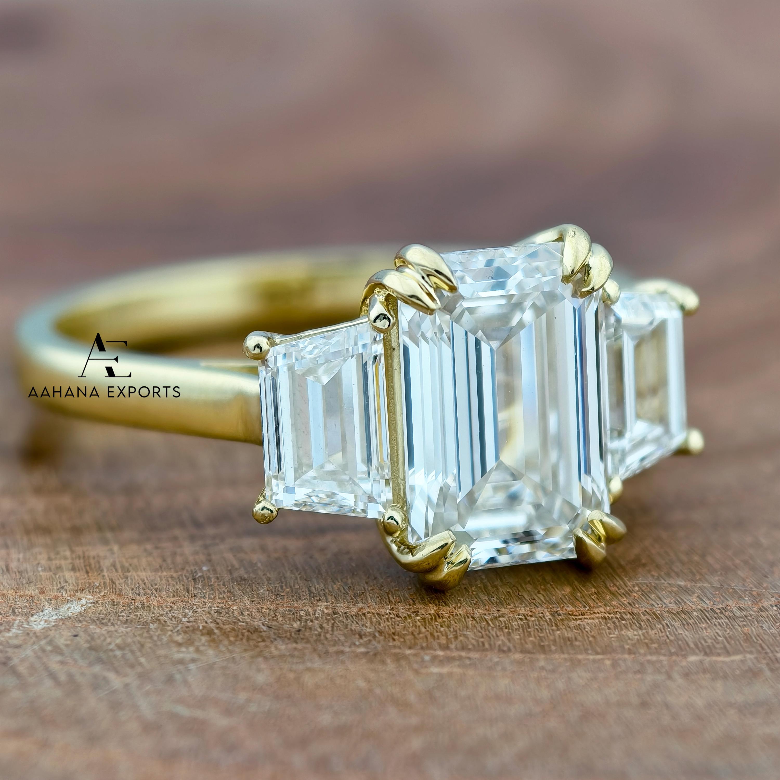 3.00 Carat Lab Grown Emerald Cut Diamond Engagement Ring, Three Stone Ring, Side Step-Cut Trapezoid Diamonds, Handmade in Tulip Setting