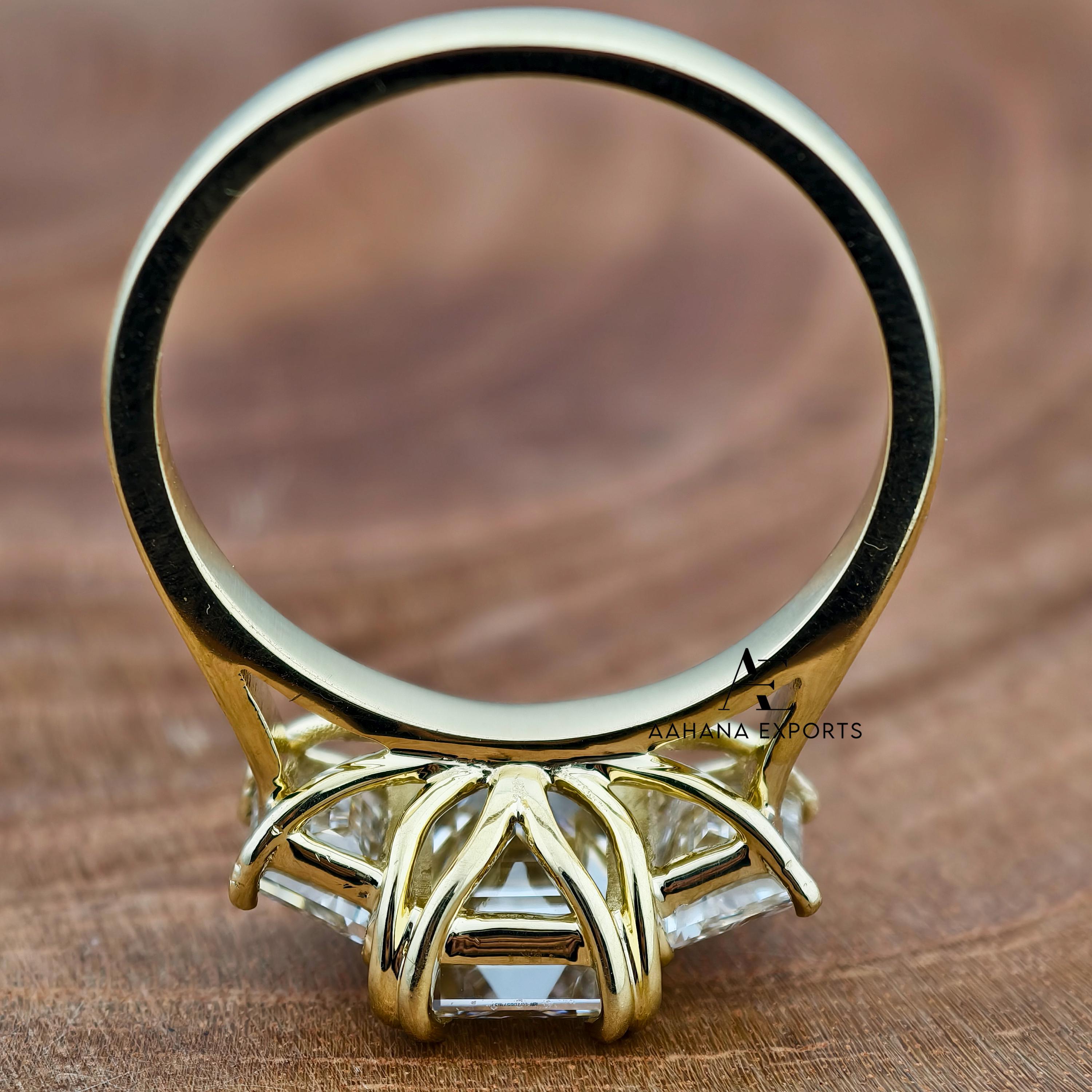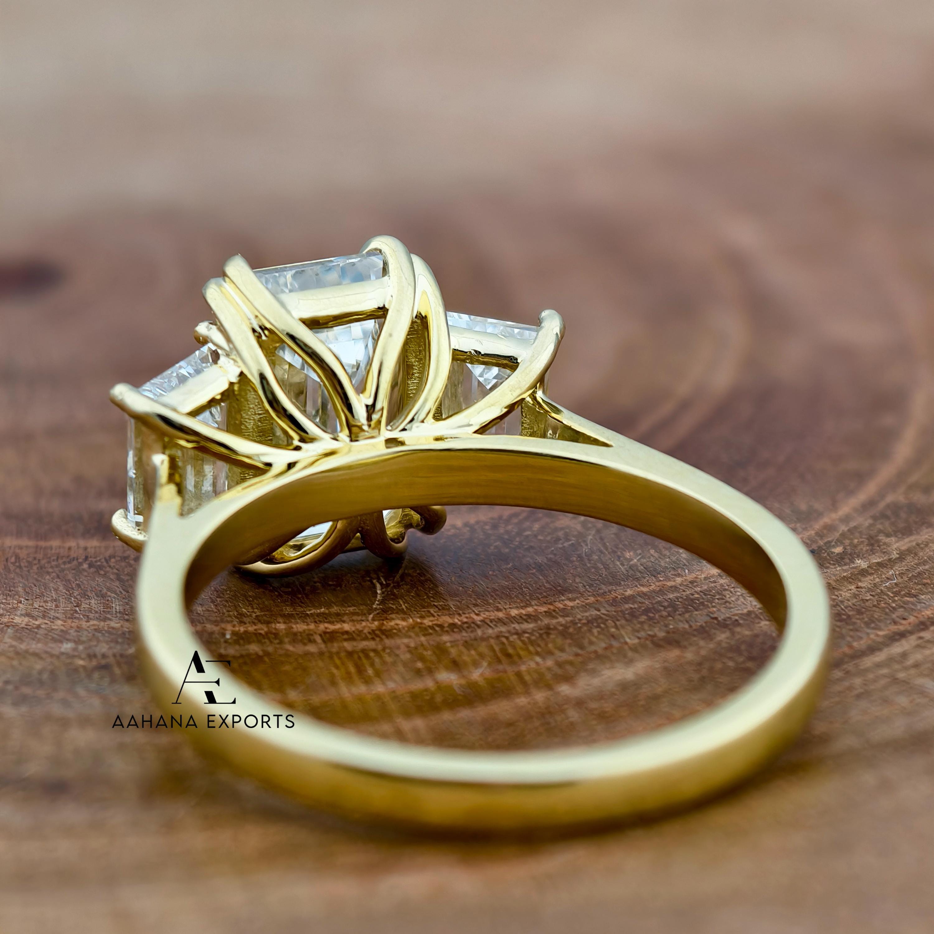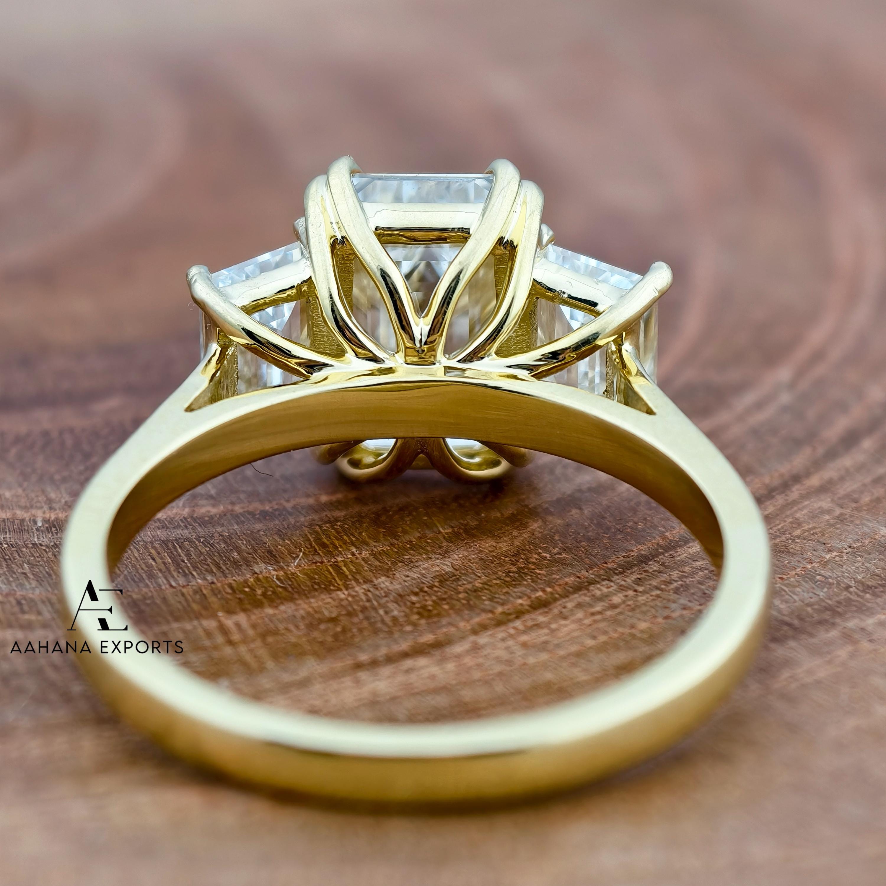 3.00 Carat Lab Grown Emerald Cut Diamond Engagement Ring, Three Stone Ring, Side Step-Cut Trapezoid Diamonds, Handmade in Tulip Setting