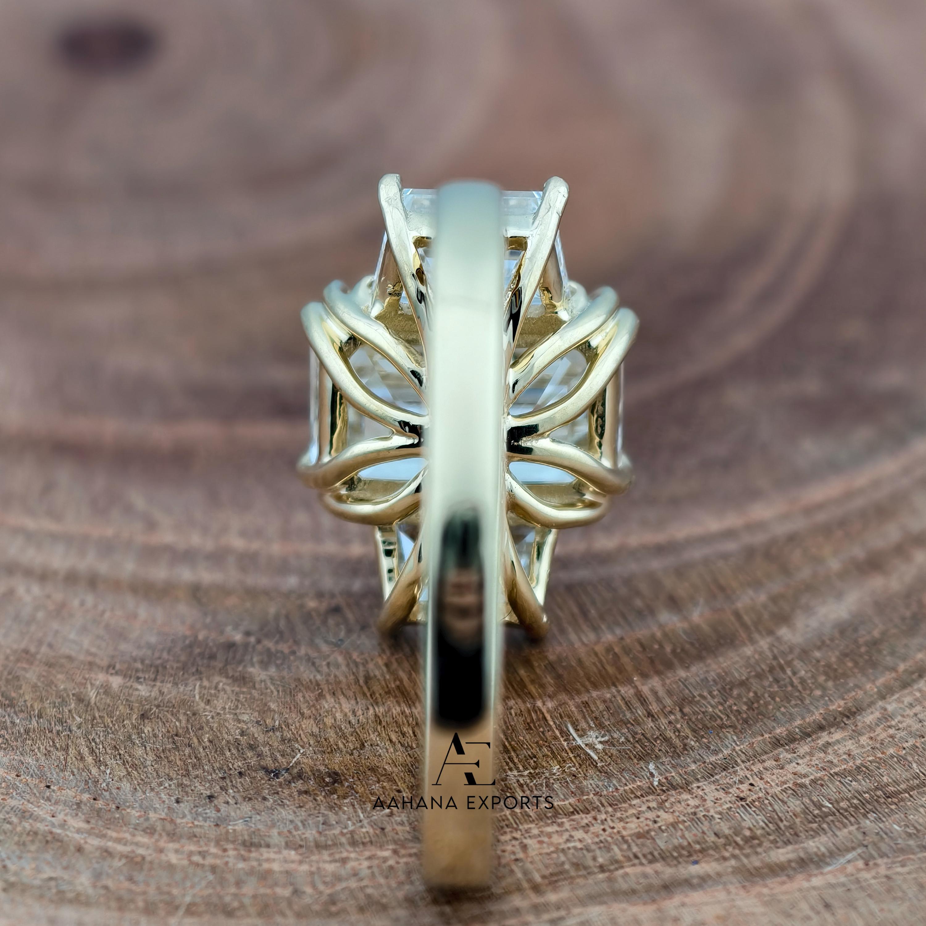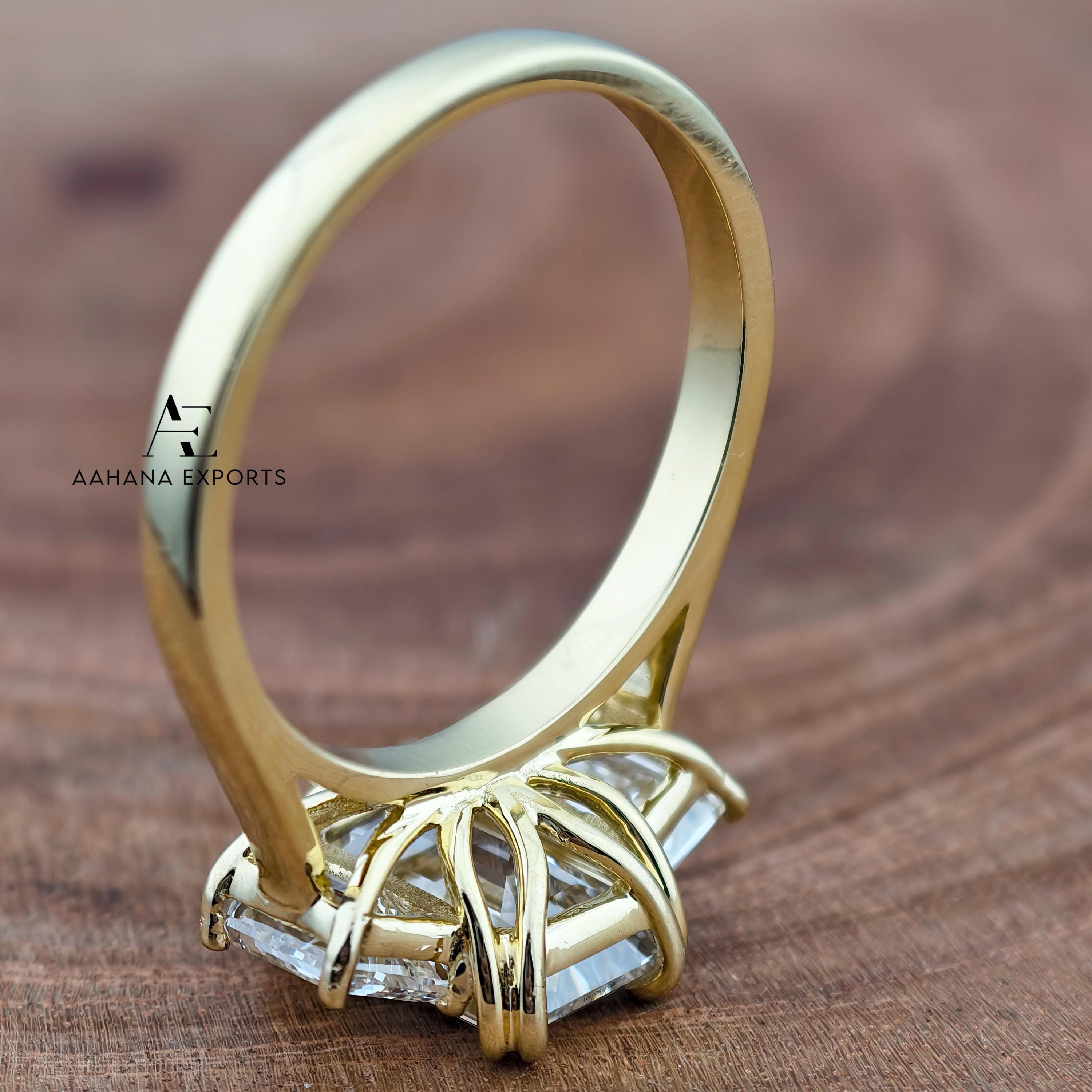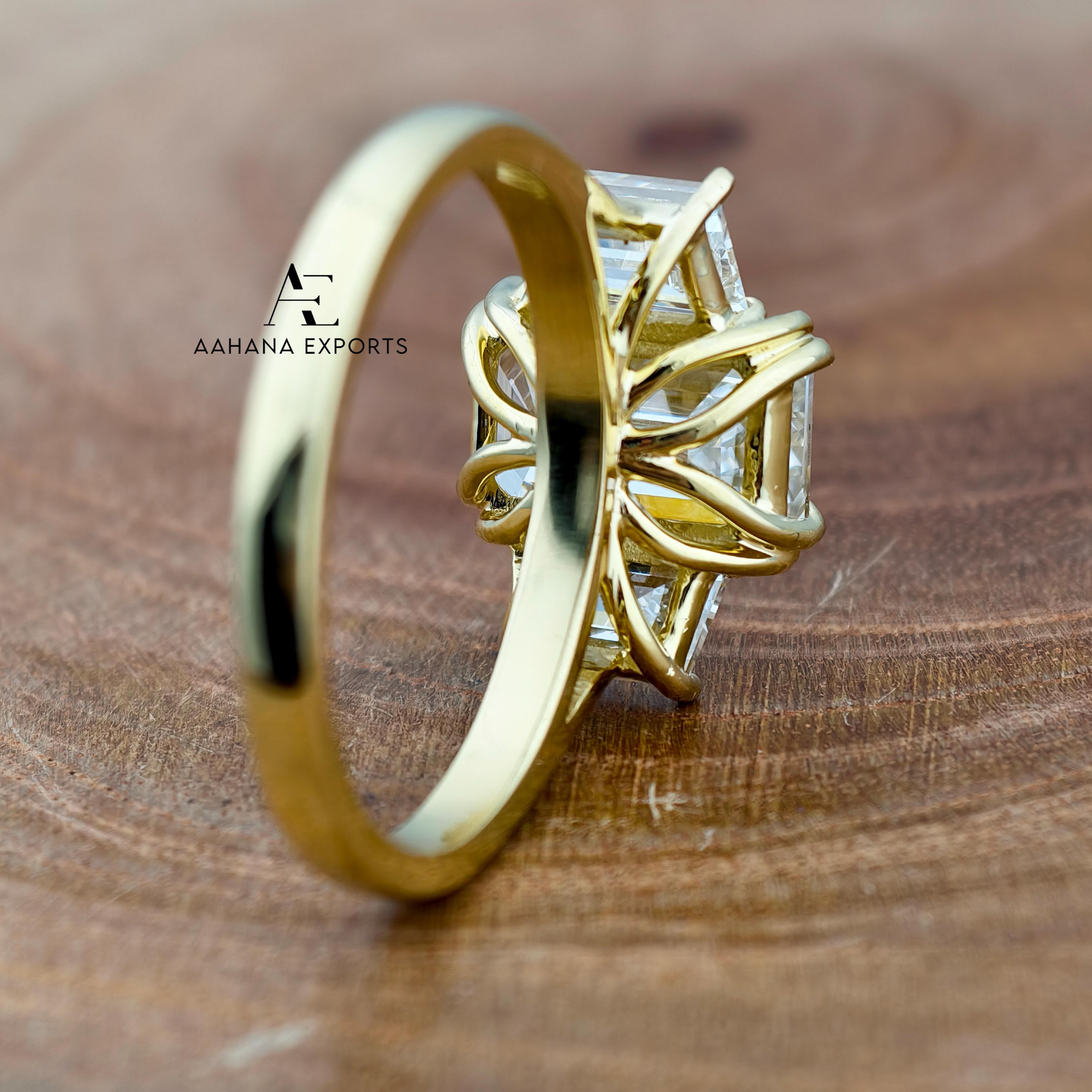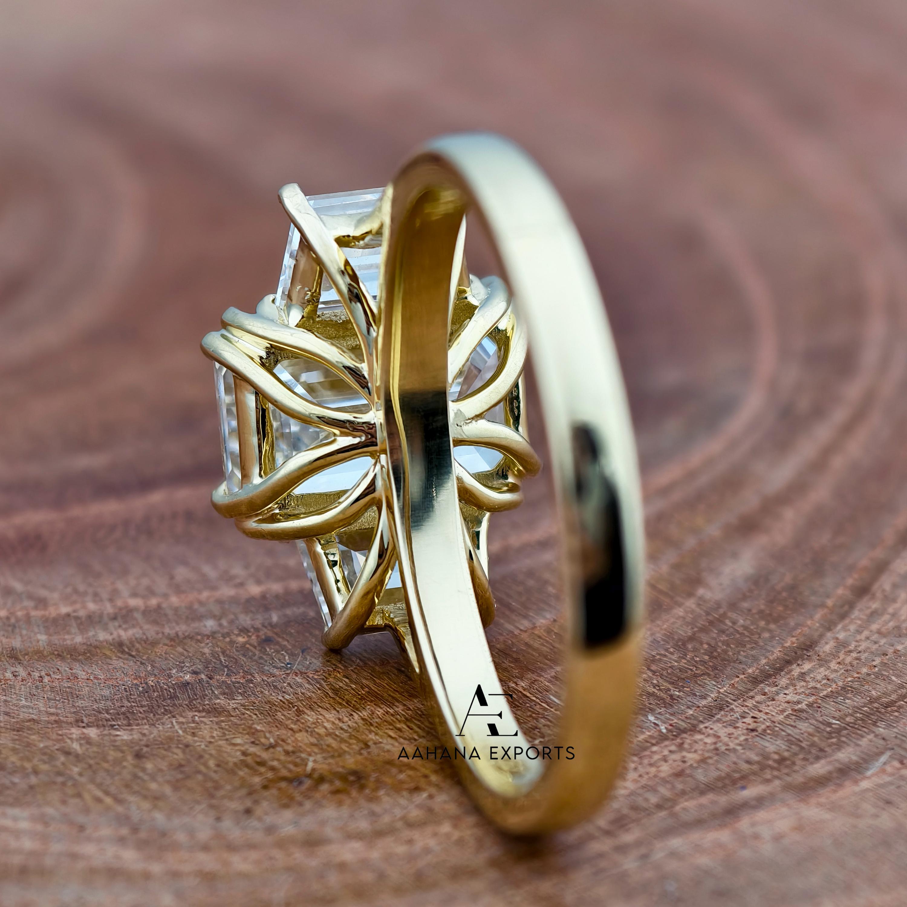 3.00 Carat Lab Grown Emerald Cut Diamond Engagement Ring, Three Stone Ring, Side Step-Cut Trapezoid Diamonds, Handmade in Tulip Setting