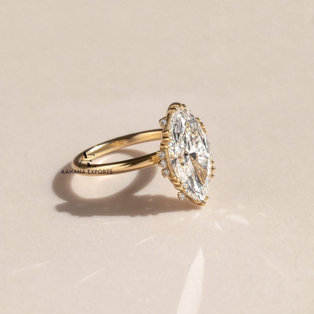 3 Carat Marquise Lab-Grown Diamond Ring | Starburst Crown Engagement Ring | Yellow Gold Vintage Style | IGI Certified Unique Wedding Ring.