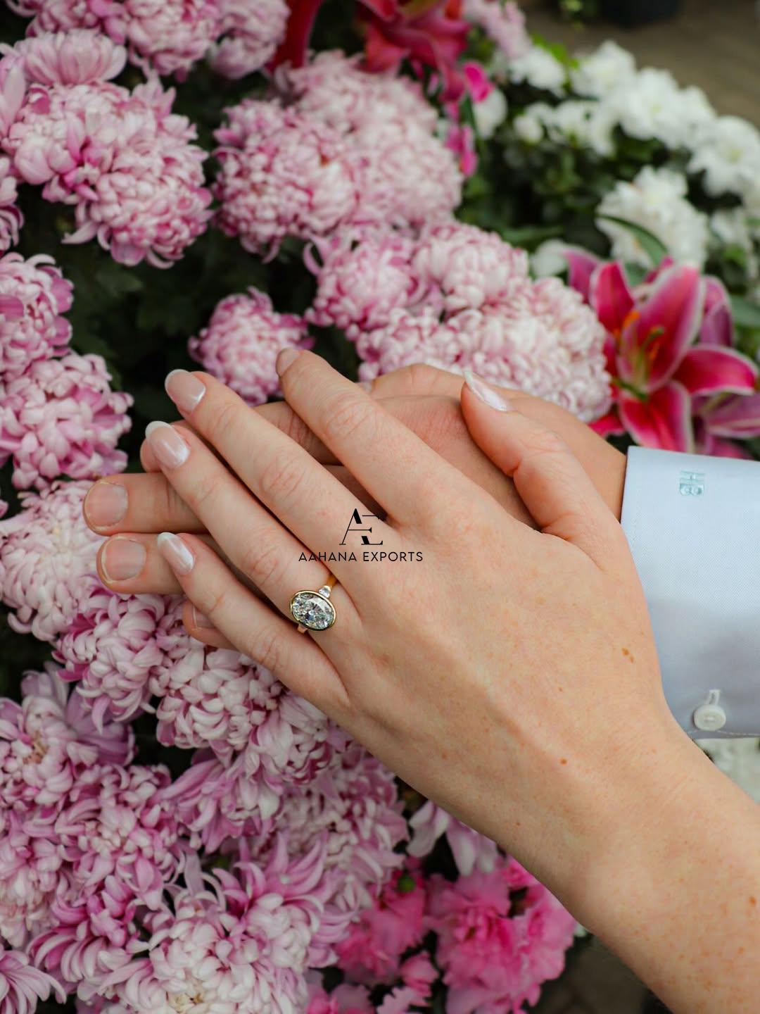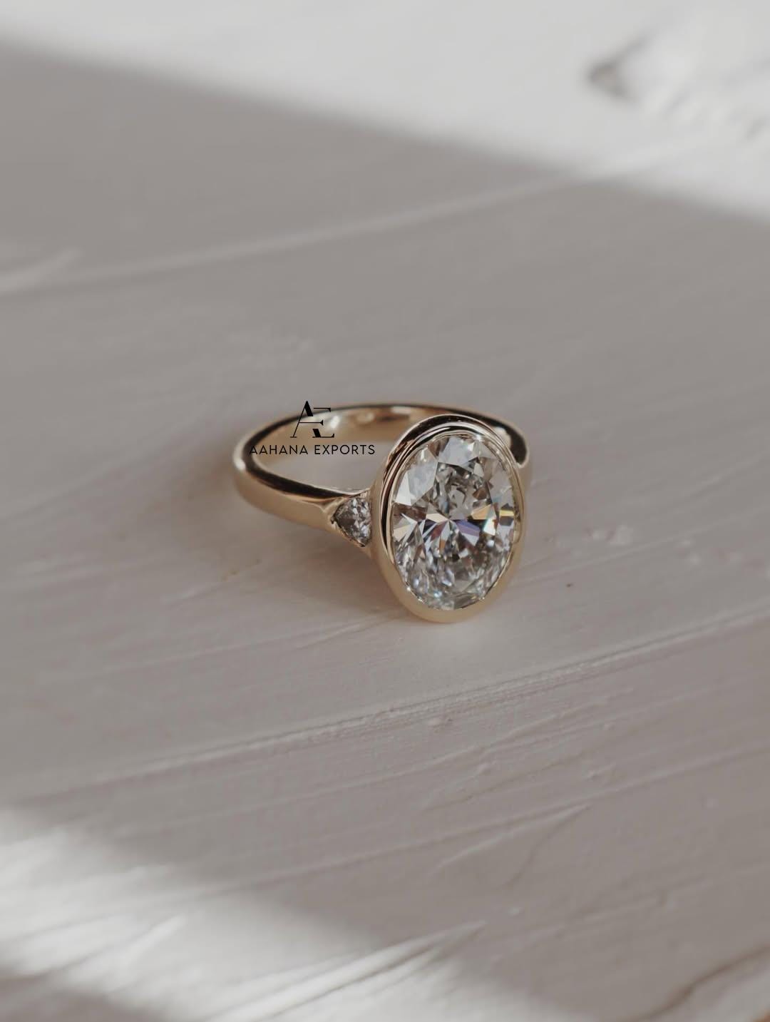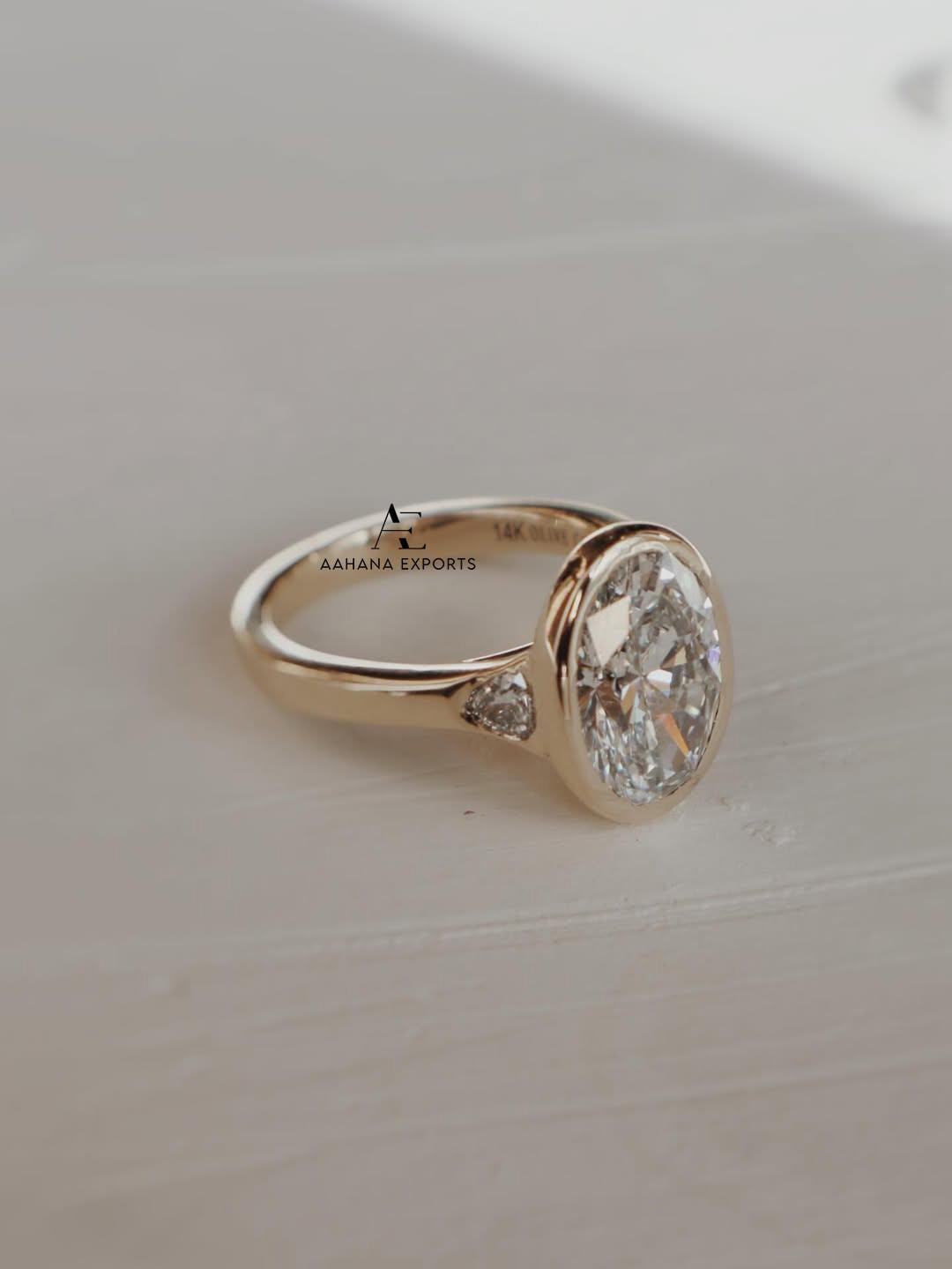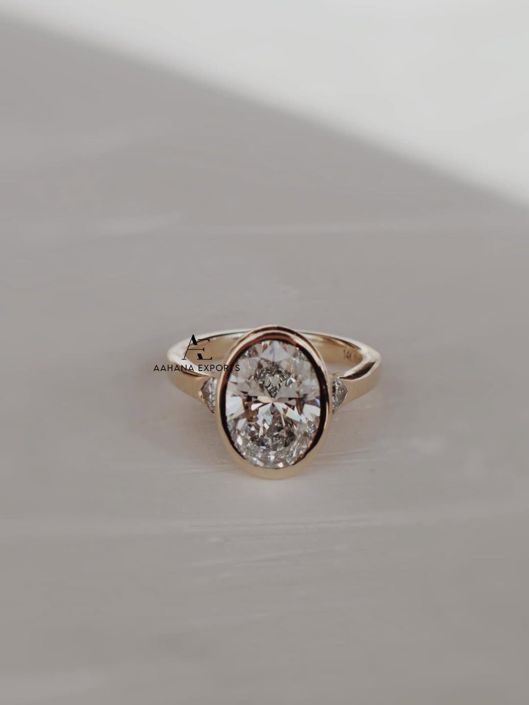 3 Carat Oval Lab Grown Diamond Ring Full Bezel: Oval Engagement Ring & Side Trillion Diamonds, IGI Certified Diamond, Wedding Ring for her.
