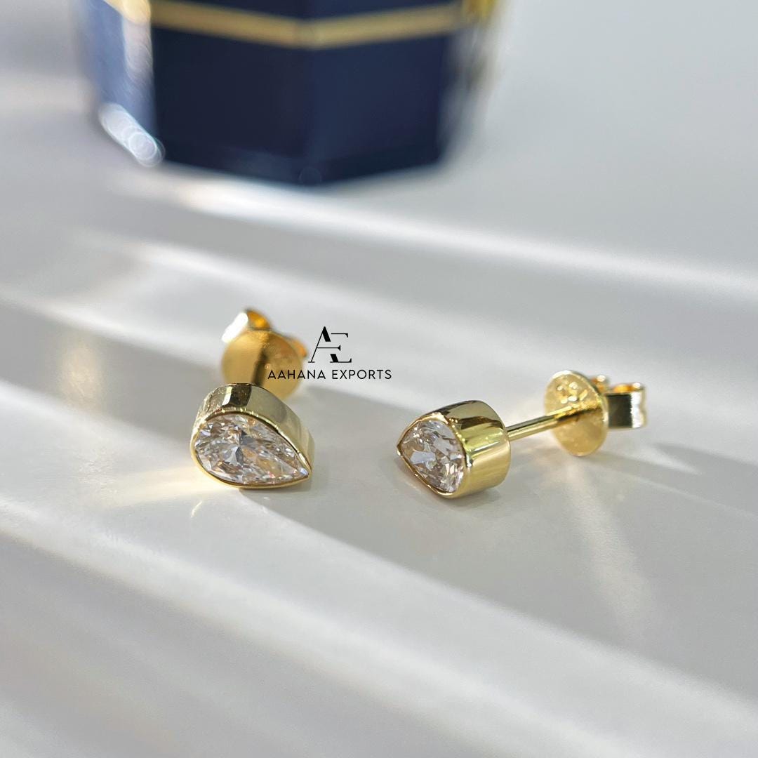 Pear Cut Lab Grown Diamond Bezel Set Studs, CVD Diamond Solitaire Earrings, 14K Solid Gold Bridesmaid Earrings, Screw Back Diamond Earrings