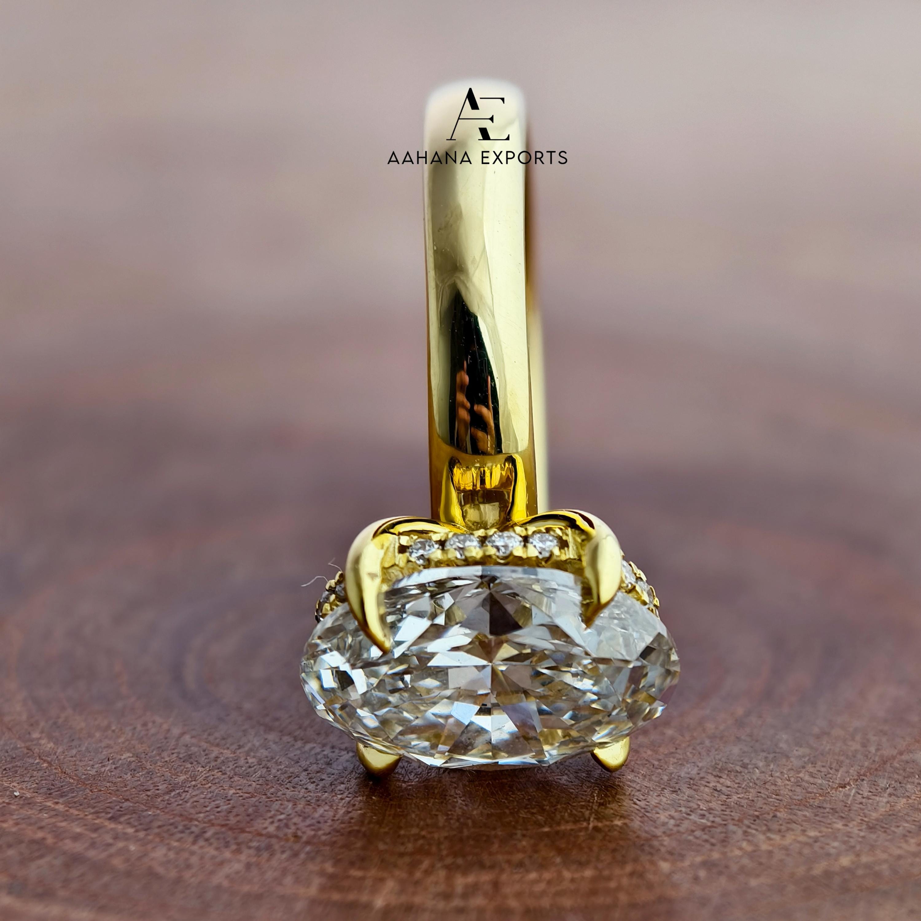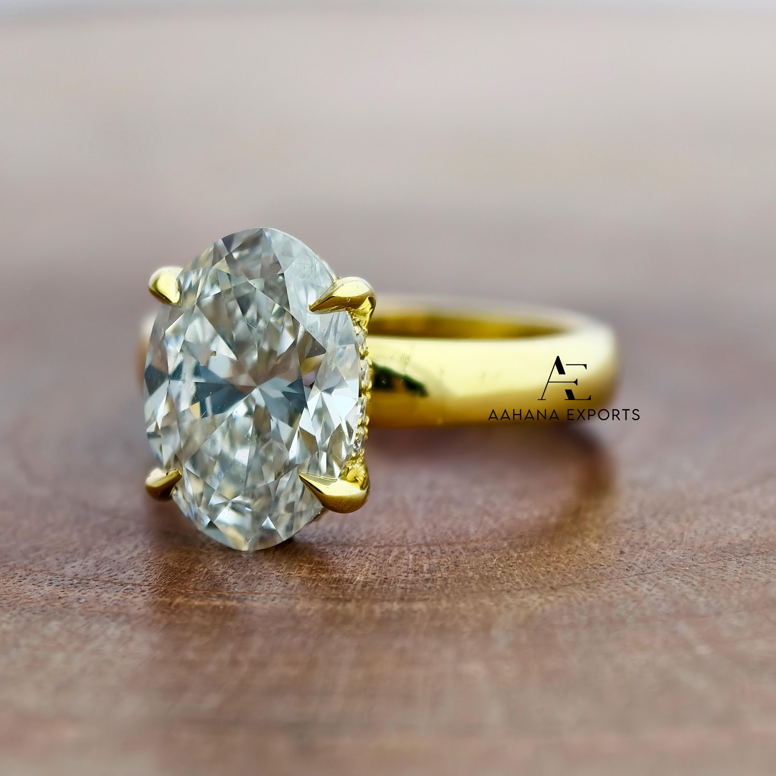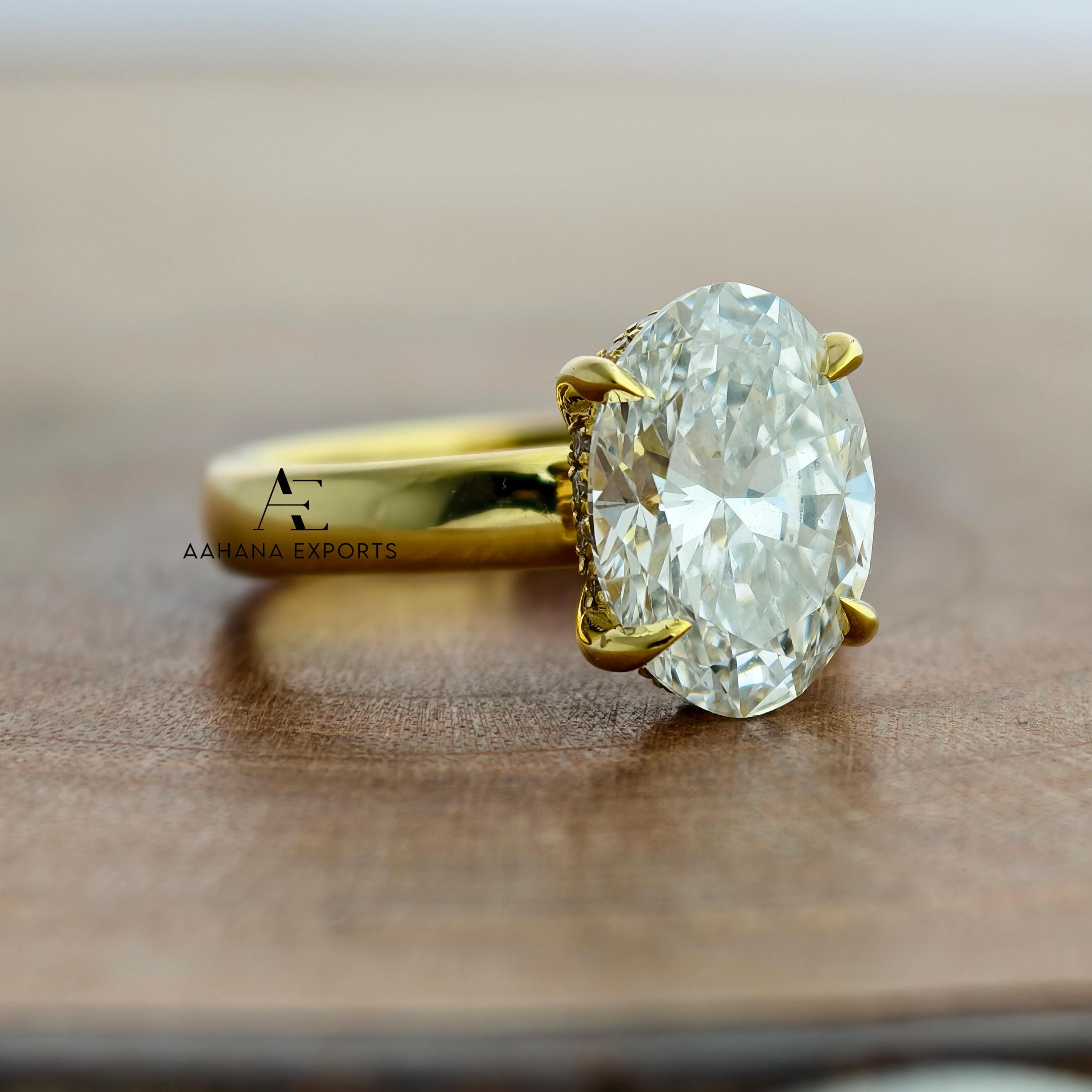 Certified 2.00 CT Lab Grown Diamond Ring, 3.00mm Cigar Band Oval Lab Diamond Engagement Ring, Hidden Halo Ring, Solid 18KT Yellow Gold Ring.