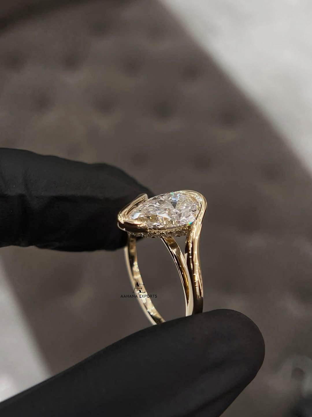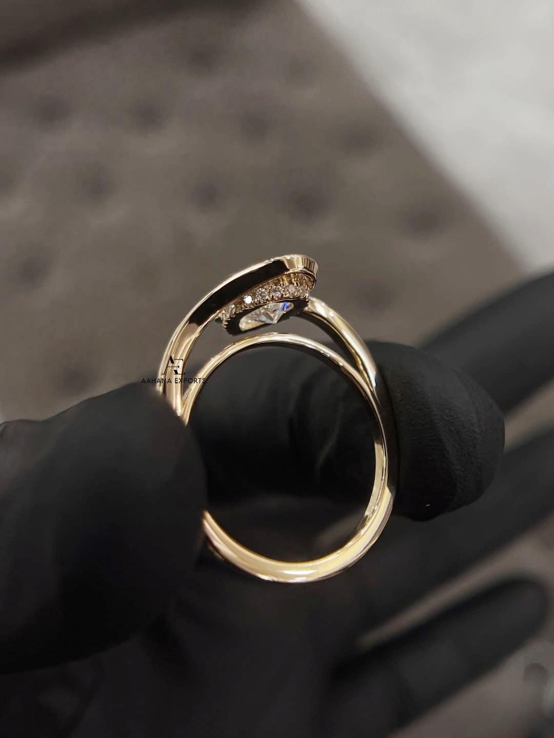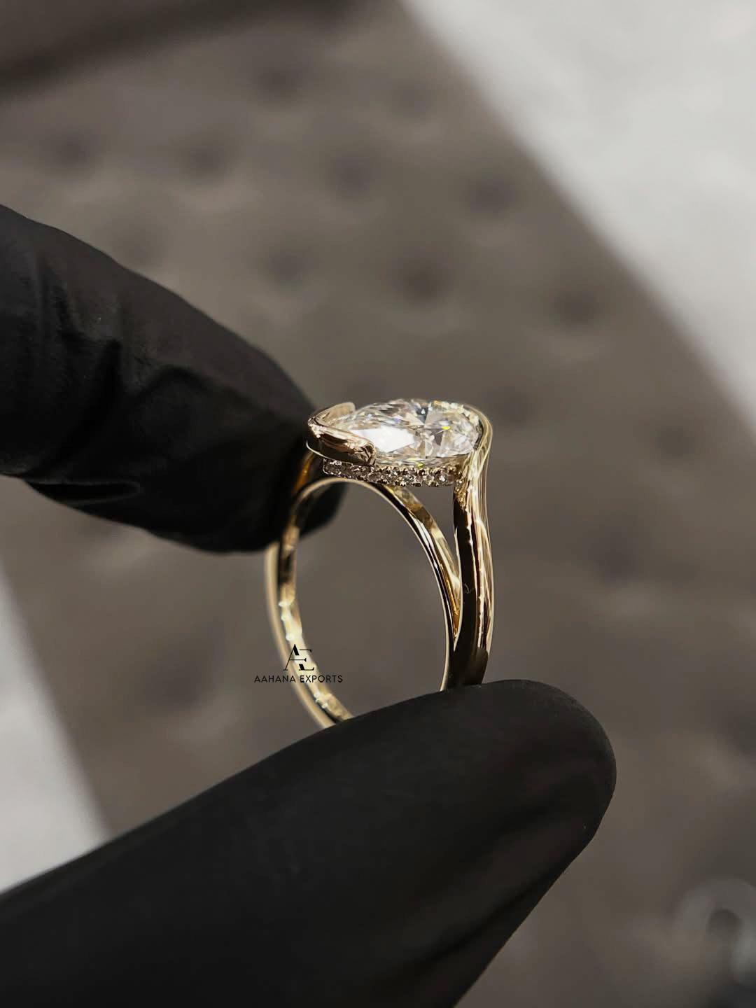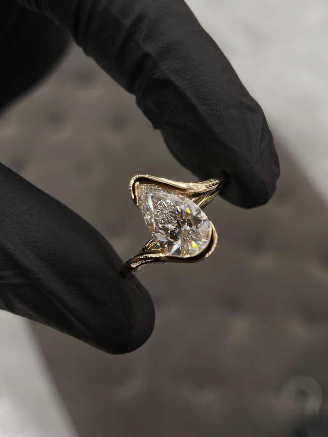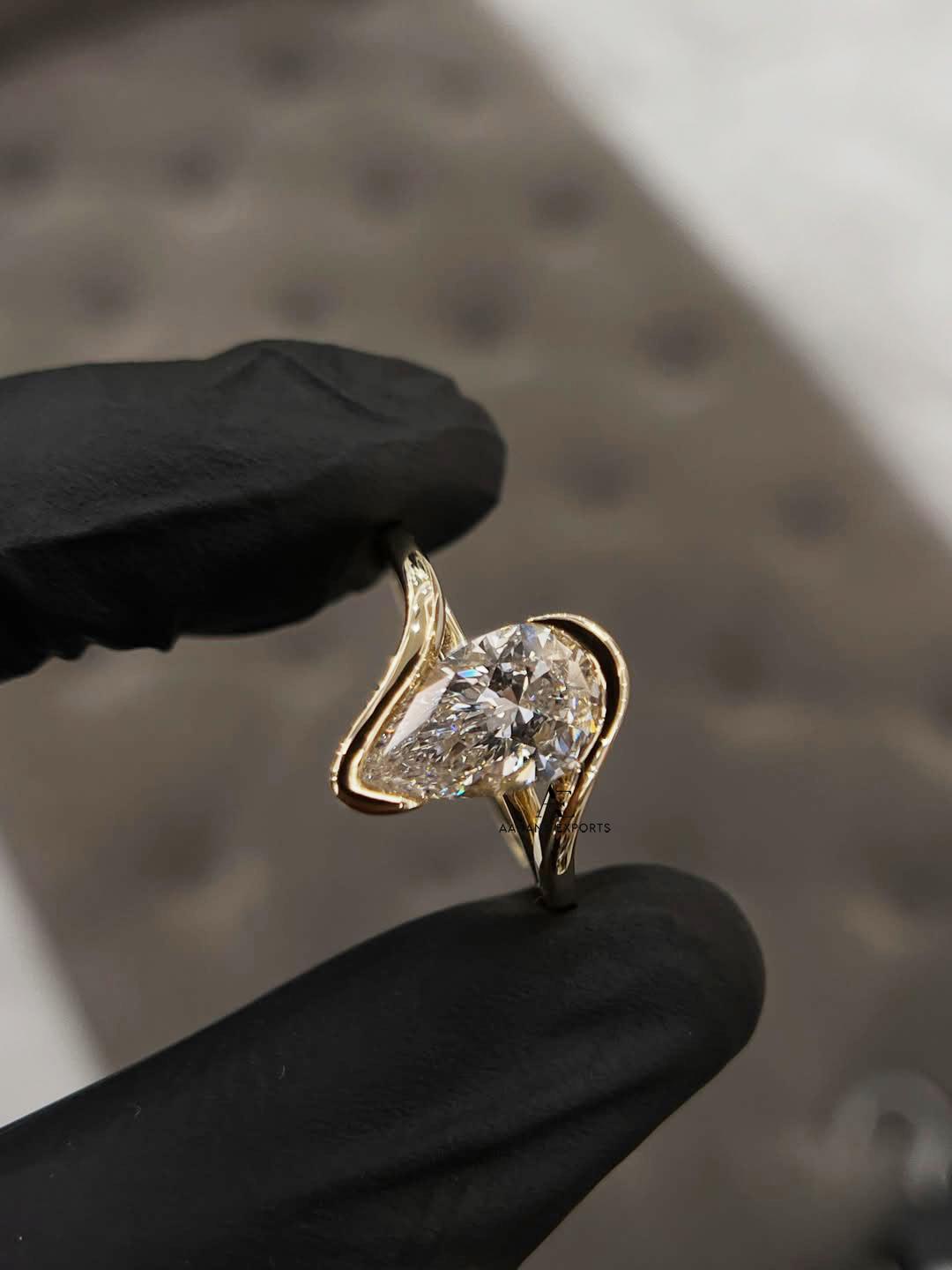1 Carat IGI Certified Pear Shape Lab Grown Diamond Solitaire Hidden Halo Engagement Ring, Curve band, Half Bezel,10k, 14k, 18k Yellow Gold