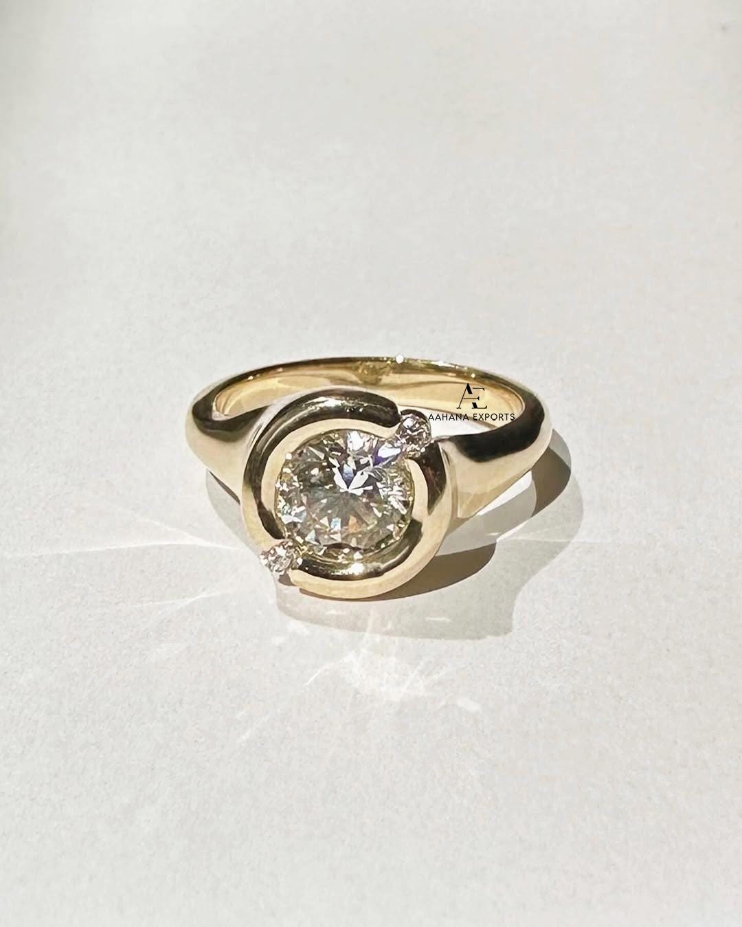 1 Carat Round E VVS2 Lab Grown Diamond Three Stone Ring / Round Shape Solitaire Stone Ring / High Set / 14k Gold Bezel Set Diamond set Bezel