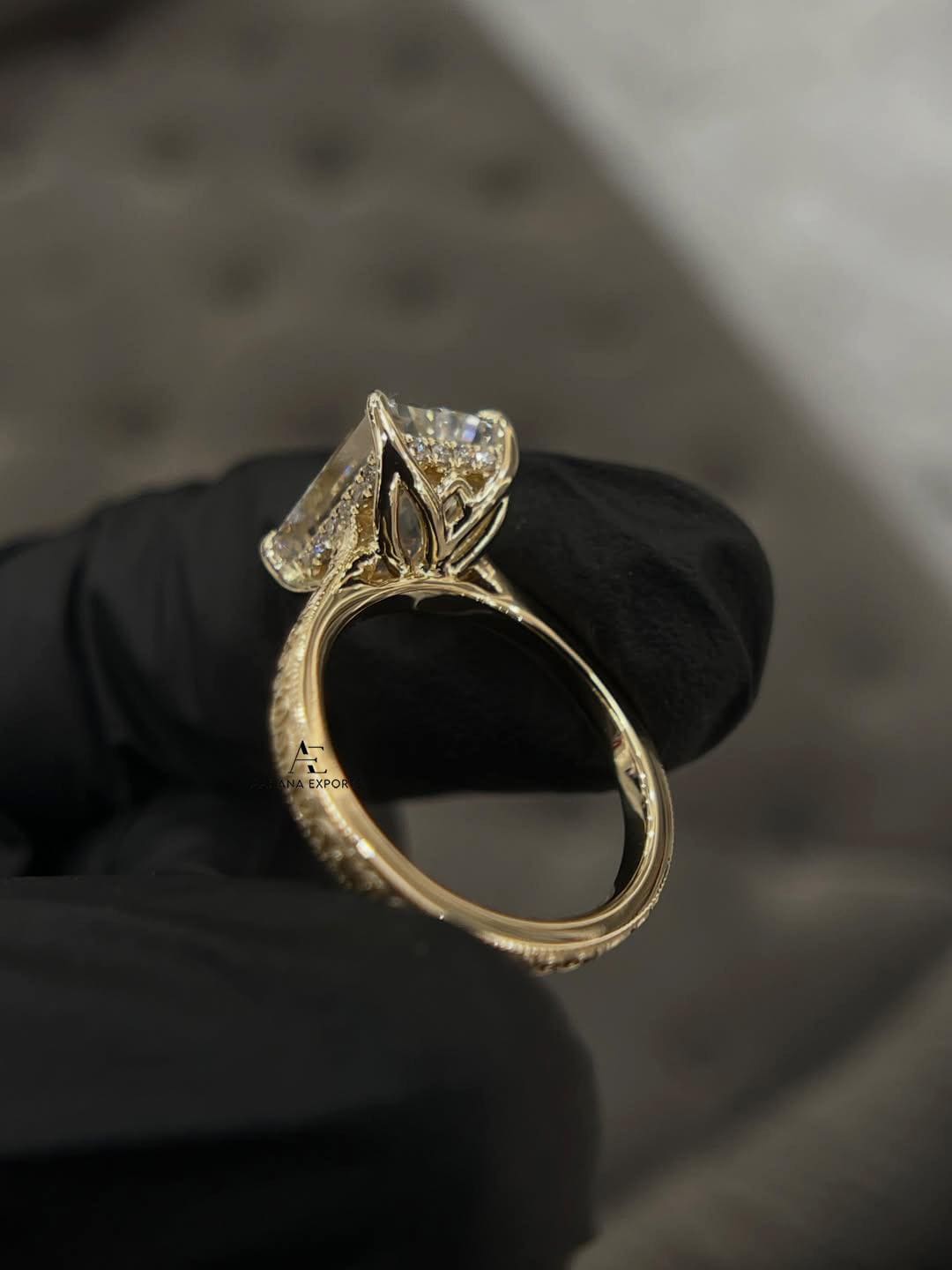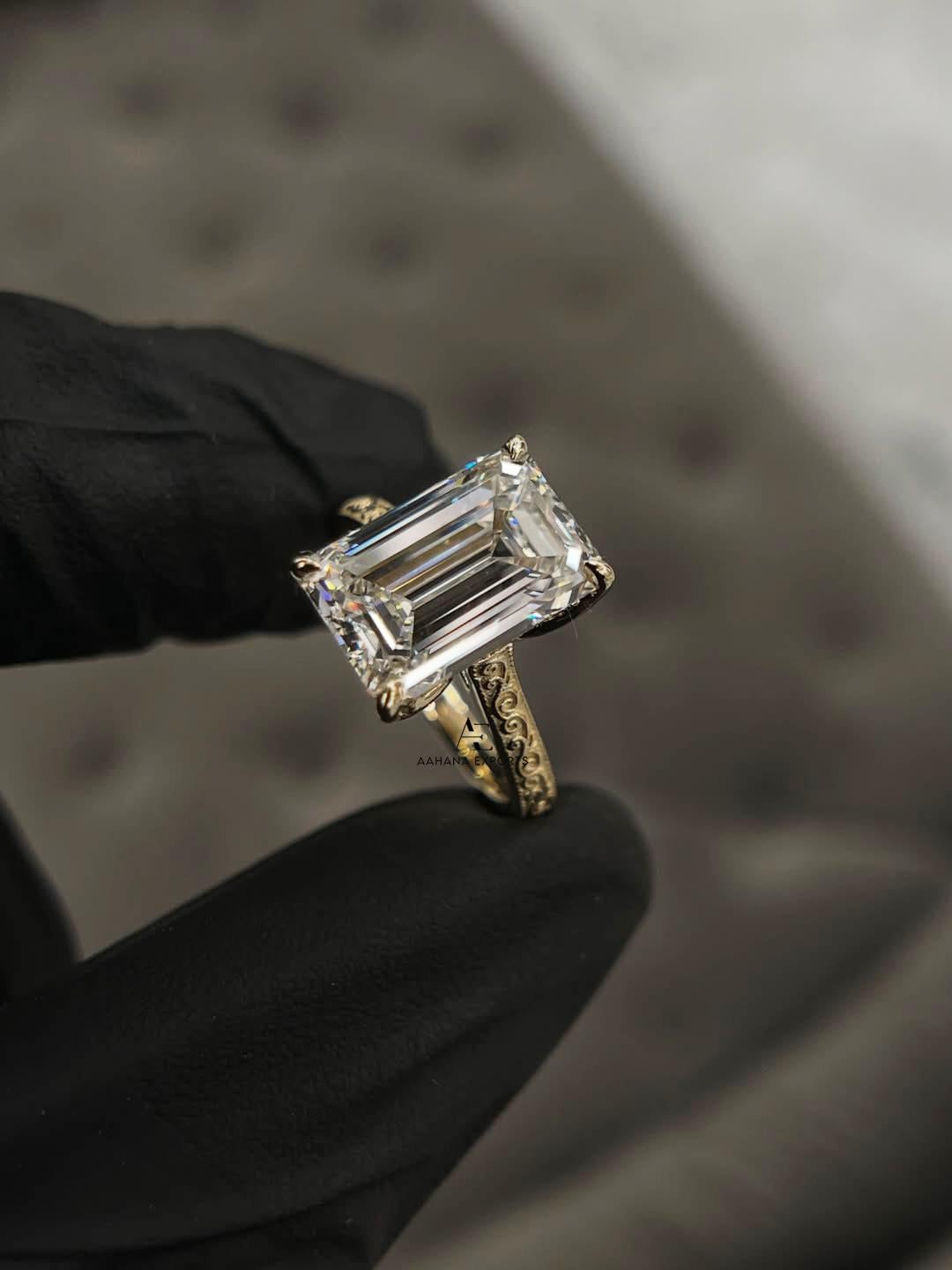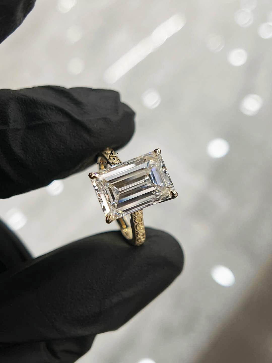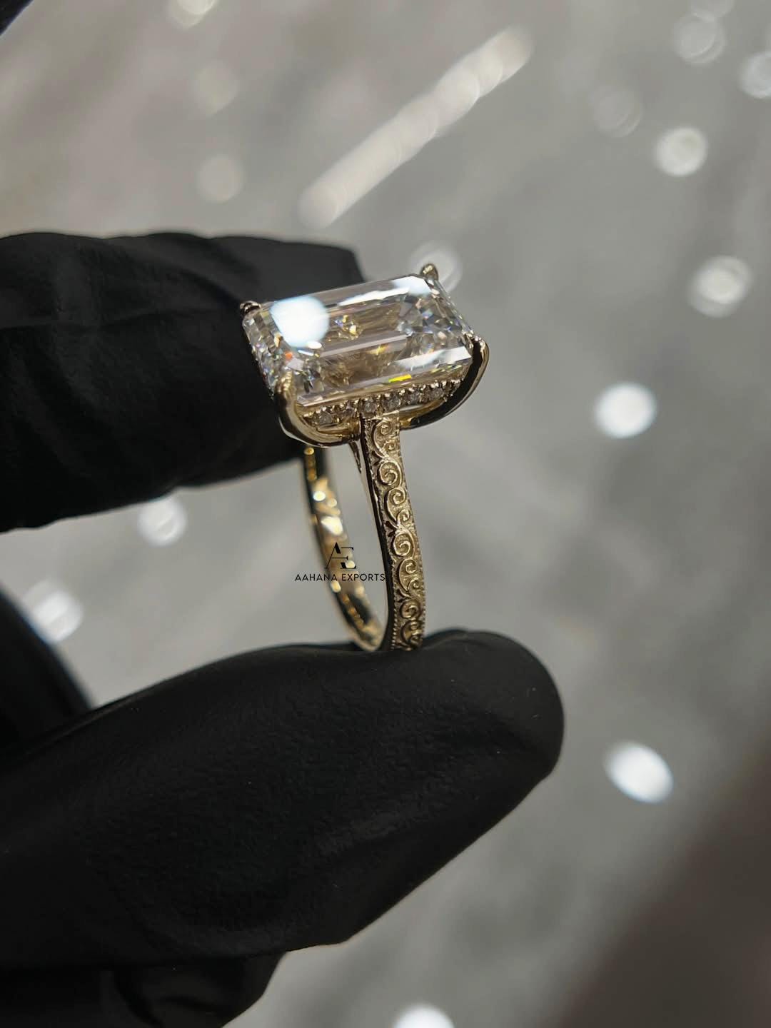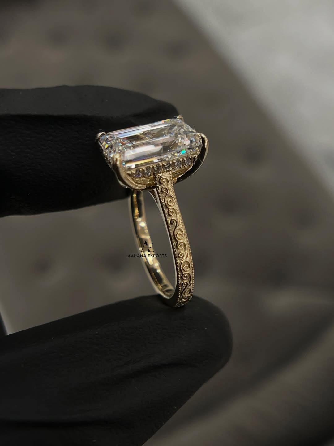 Filigree Emerald Cut Lab-Grown Engagement Ring 3 CT Art Deco Engraved Band Solitaire Ring 14K Gold Hidden Halo Ring Promise Ring For Women
