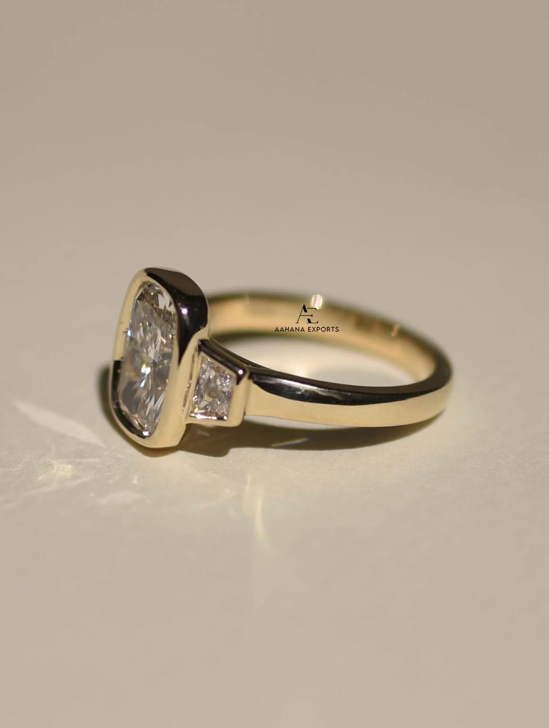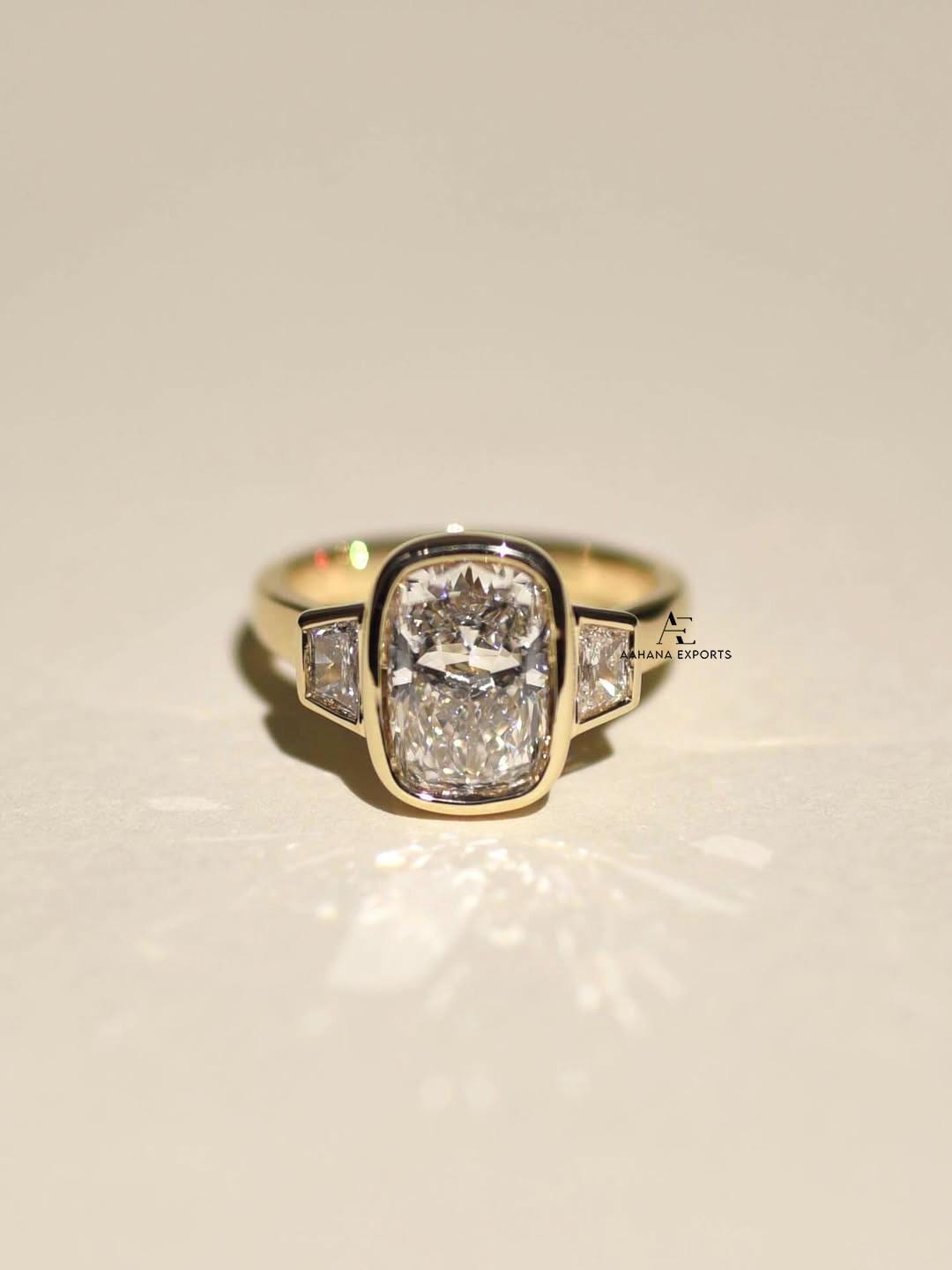 3 Carat Elongated Cushion E VS1 Lab Grown Diamond Bezel Set Ring / Engagement Ring / Elongated Diamond Art Deco Design / Three Stone Ring.