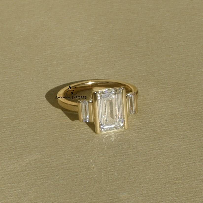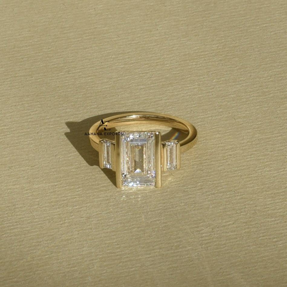 2 CT Emerald Cut Lab-Grown Diamond Engagement Ring, Three Stone Wedding Ring, Half Bezel Set, Side Baguette Ring, Anniversary Ring For Her.