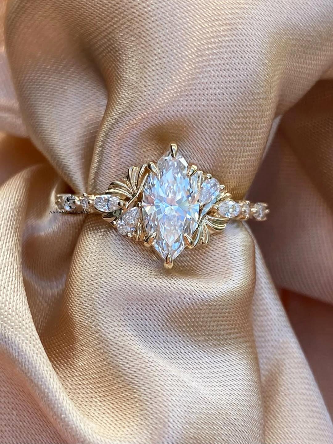 Unique Flat Wings Marquise Cut 2 CT Lab-Grown Diamond Engagement Ring, Anniversary Promise Ring Set, Antique Engraved Band Bridal Ring.