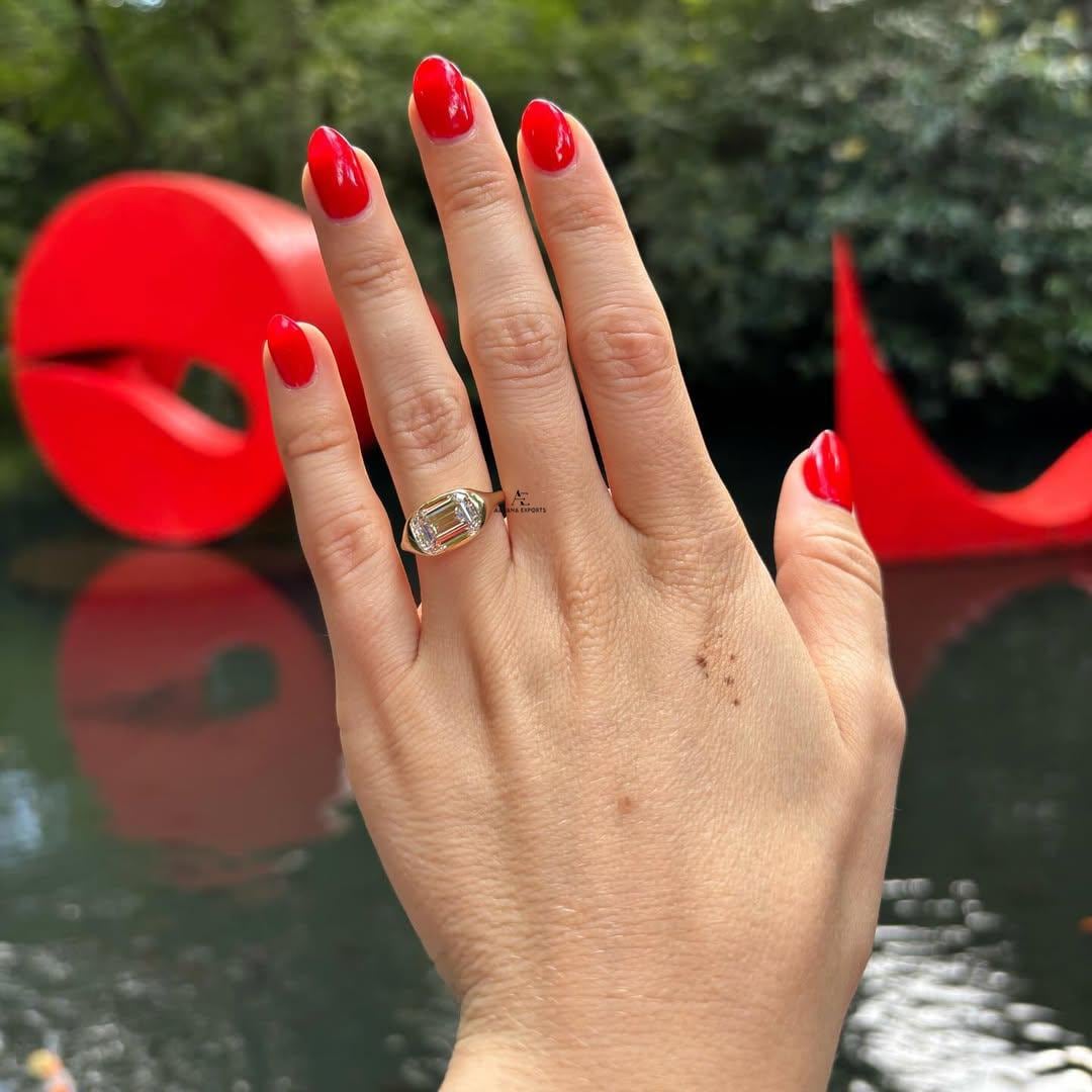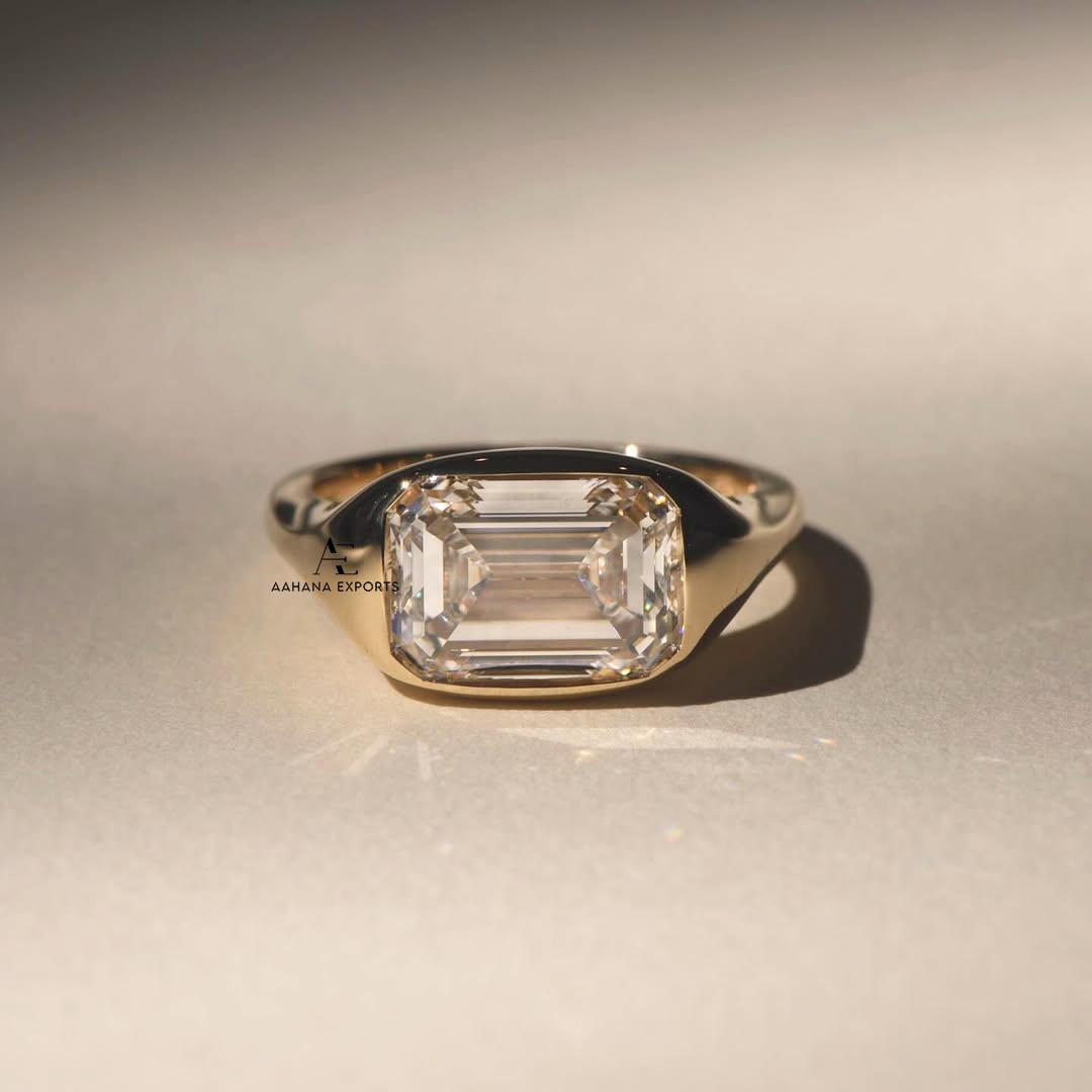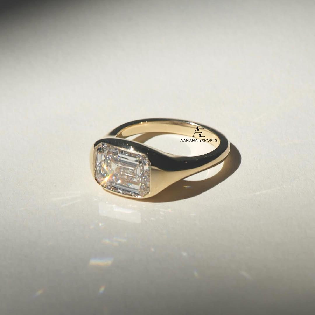 3 Carat Emerald Cut Lab Grown Diamond Engagement Ring | 14K Gold Bezel | IGI Certified | East To West Set | Anniversary Gift Ring For Her.