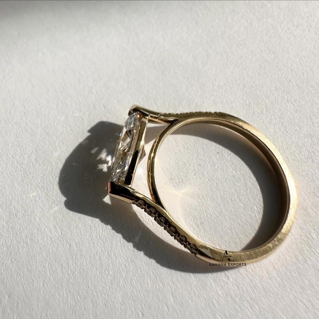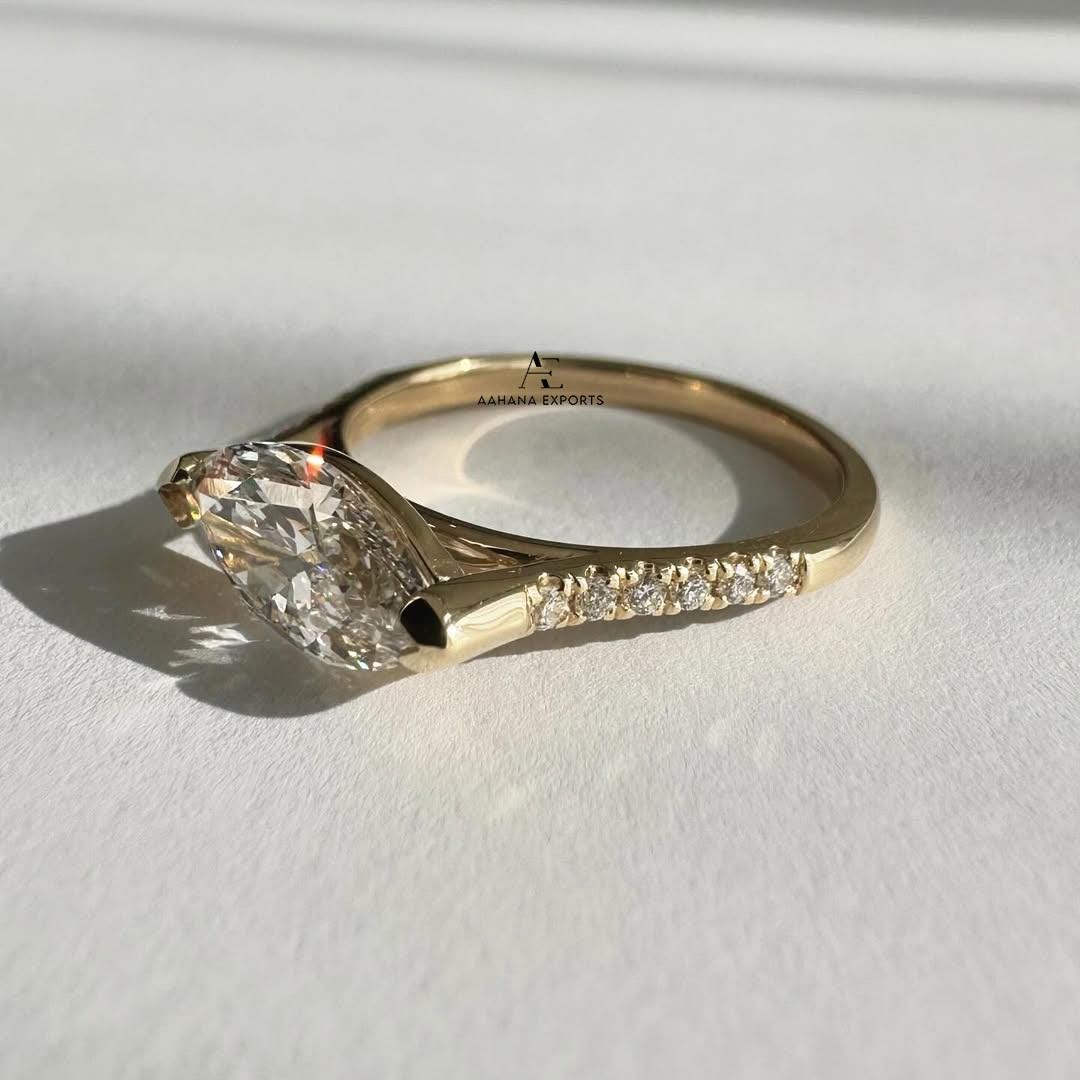 2.0 CT Lab Created Diamond Engagement Ring, Marquise Cut East To West Set Lab Grown Diamond Solitaire Ring, Half Bezel Setting