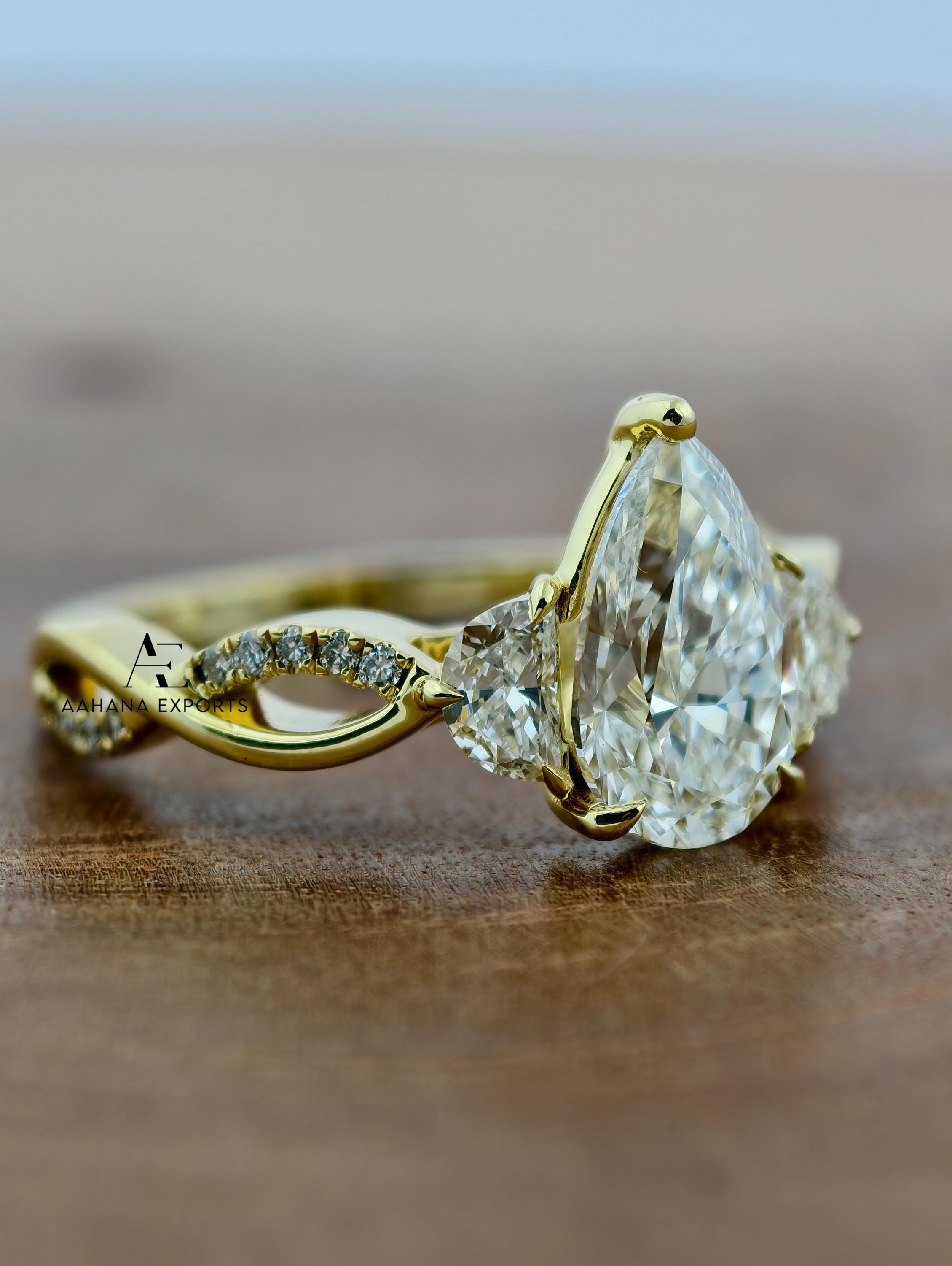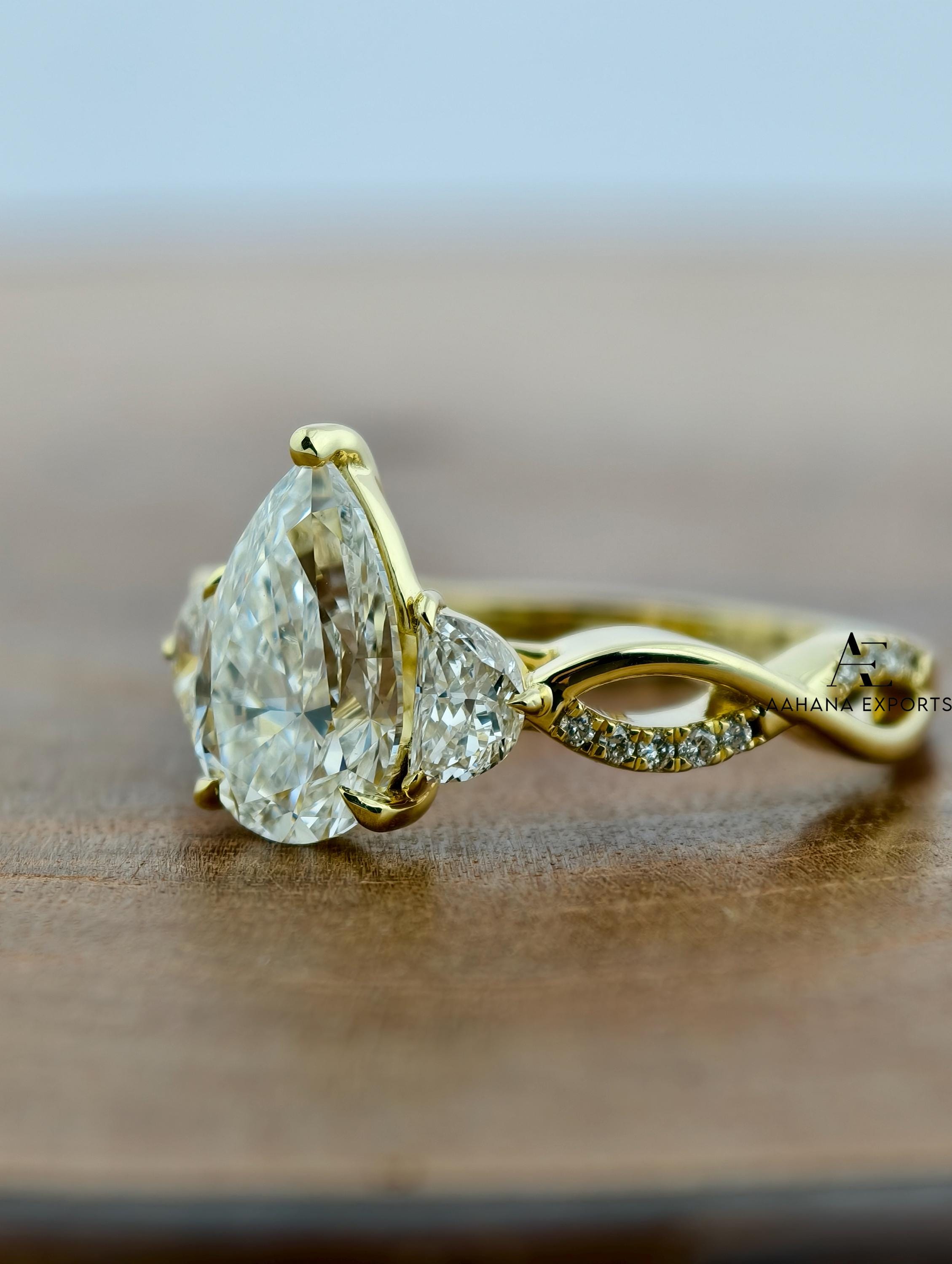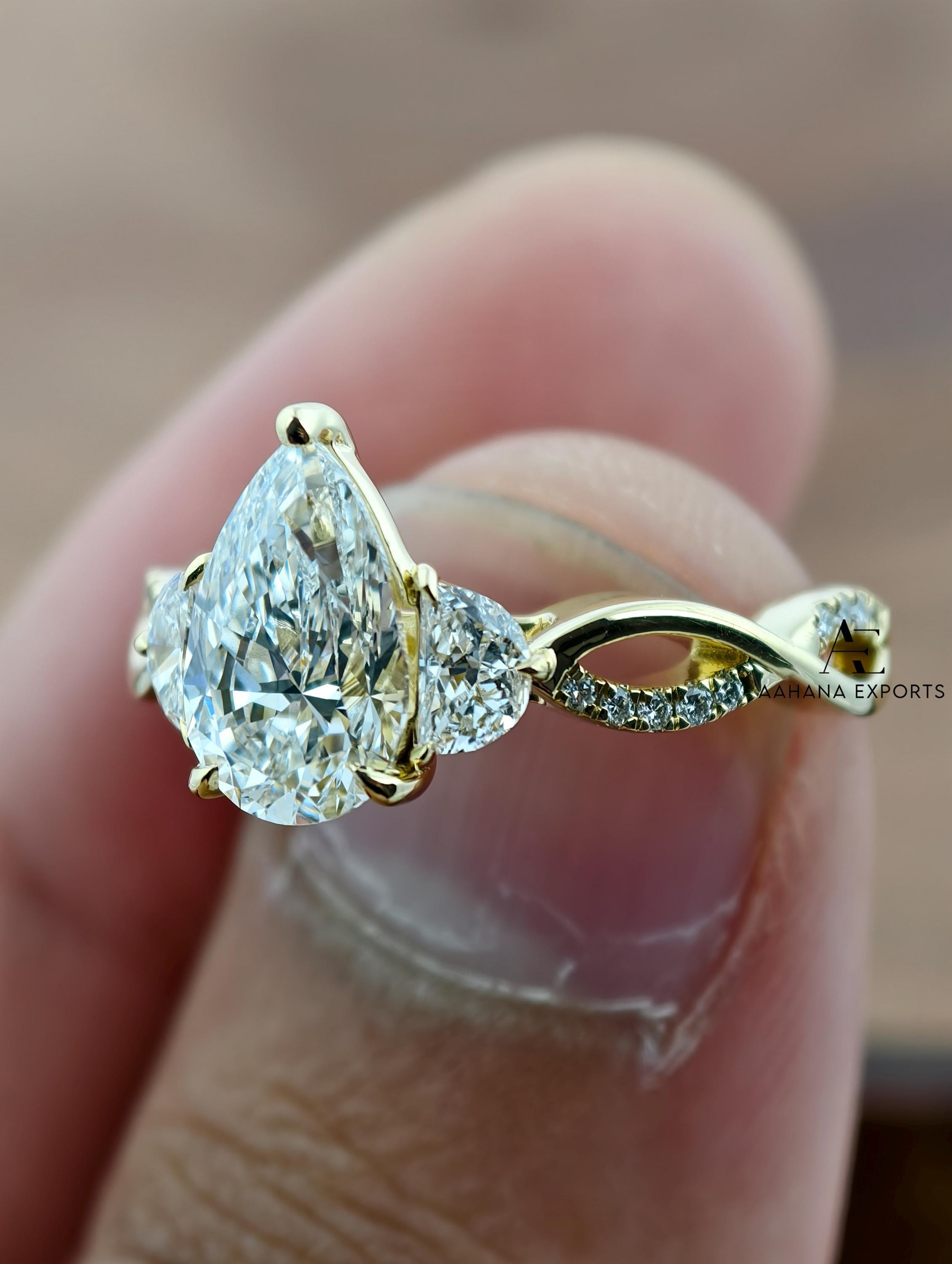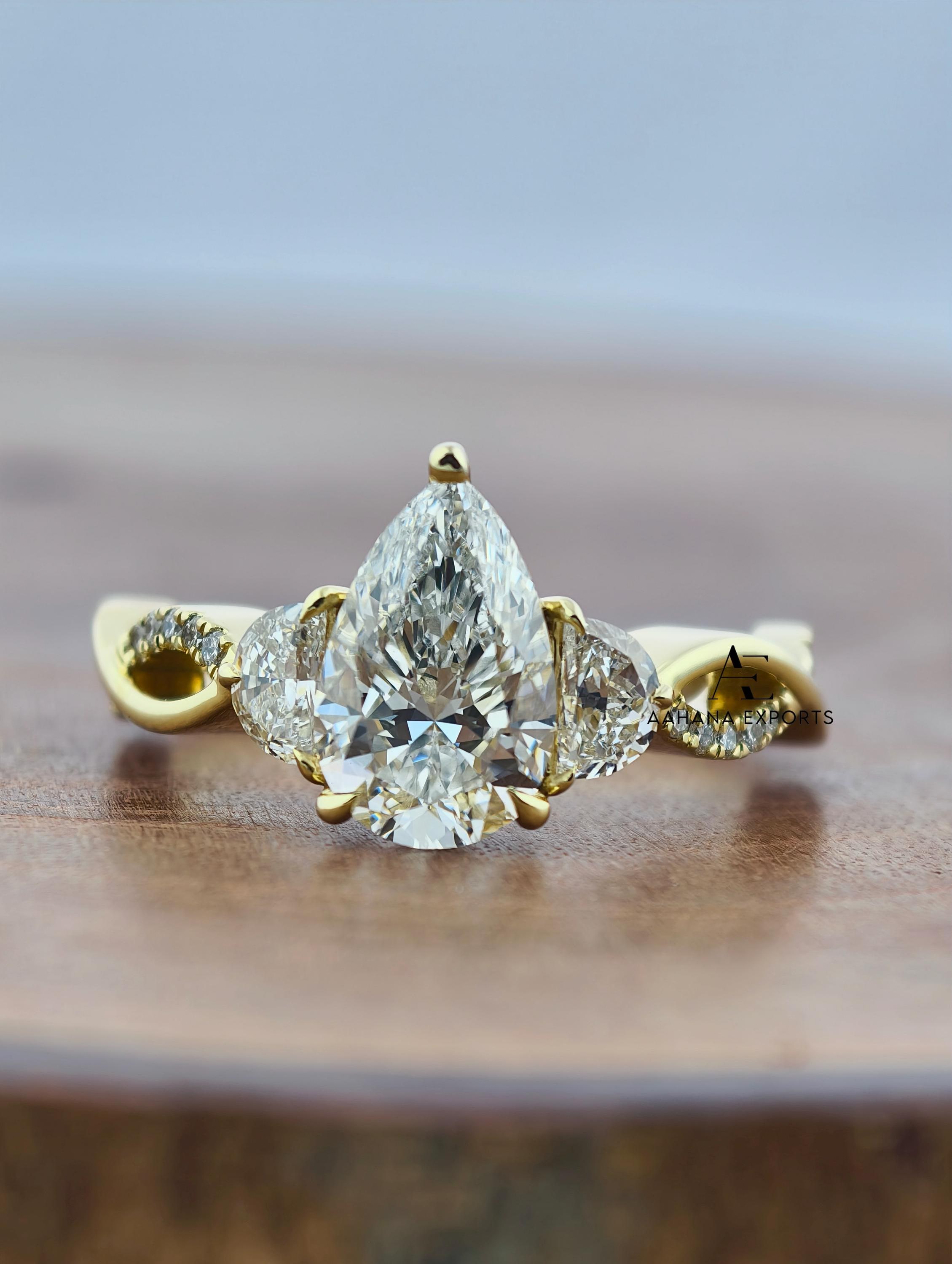 Three Stone Ring, Unique 2.00 Carat Pear & Half Moon Cut Lab Grown Diamond Engagement Ring 14K Solid Gold Twisted Pave Wedding Band for her.