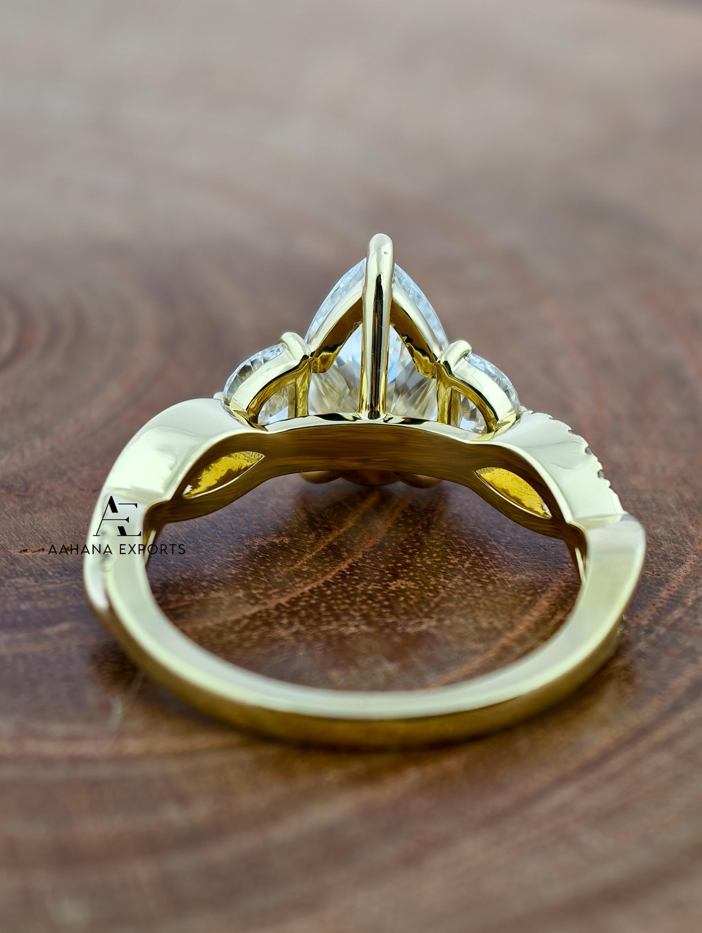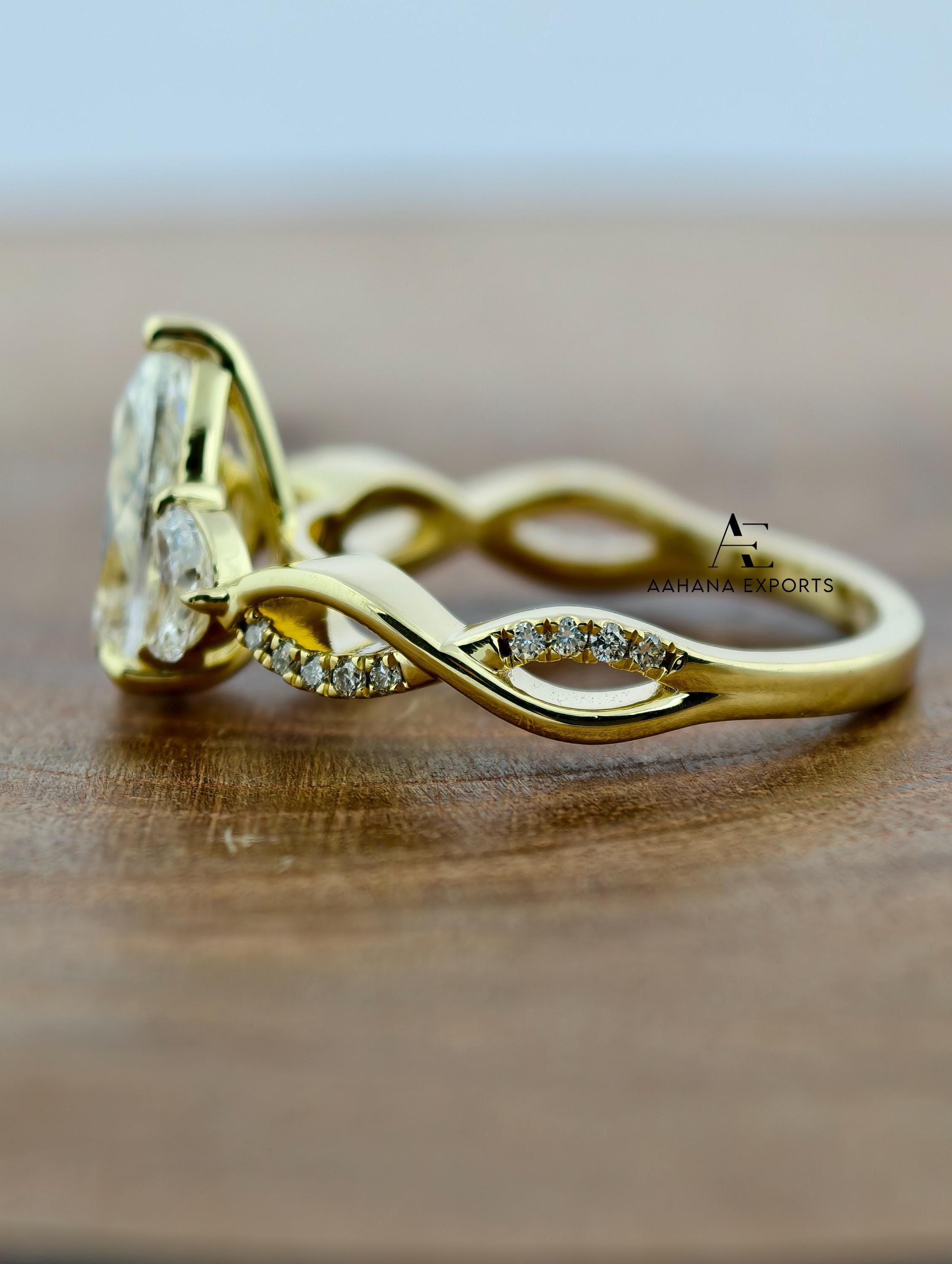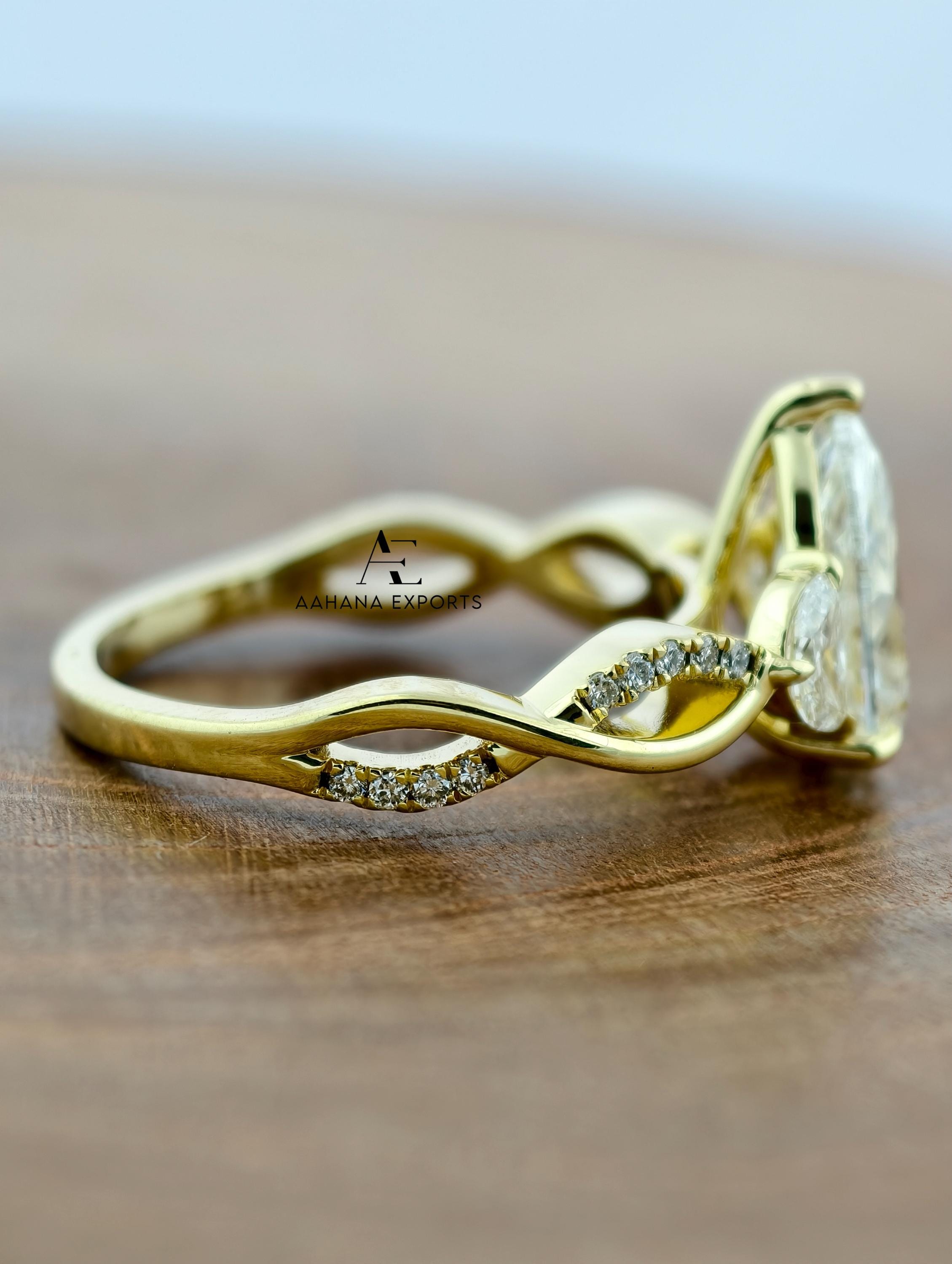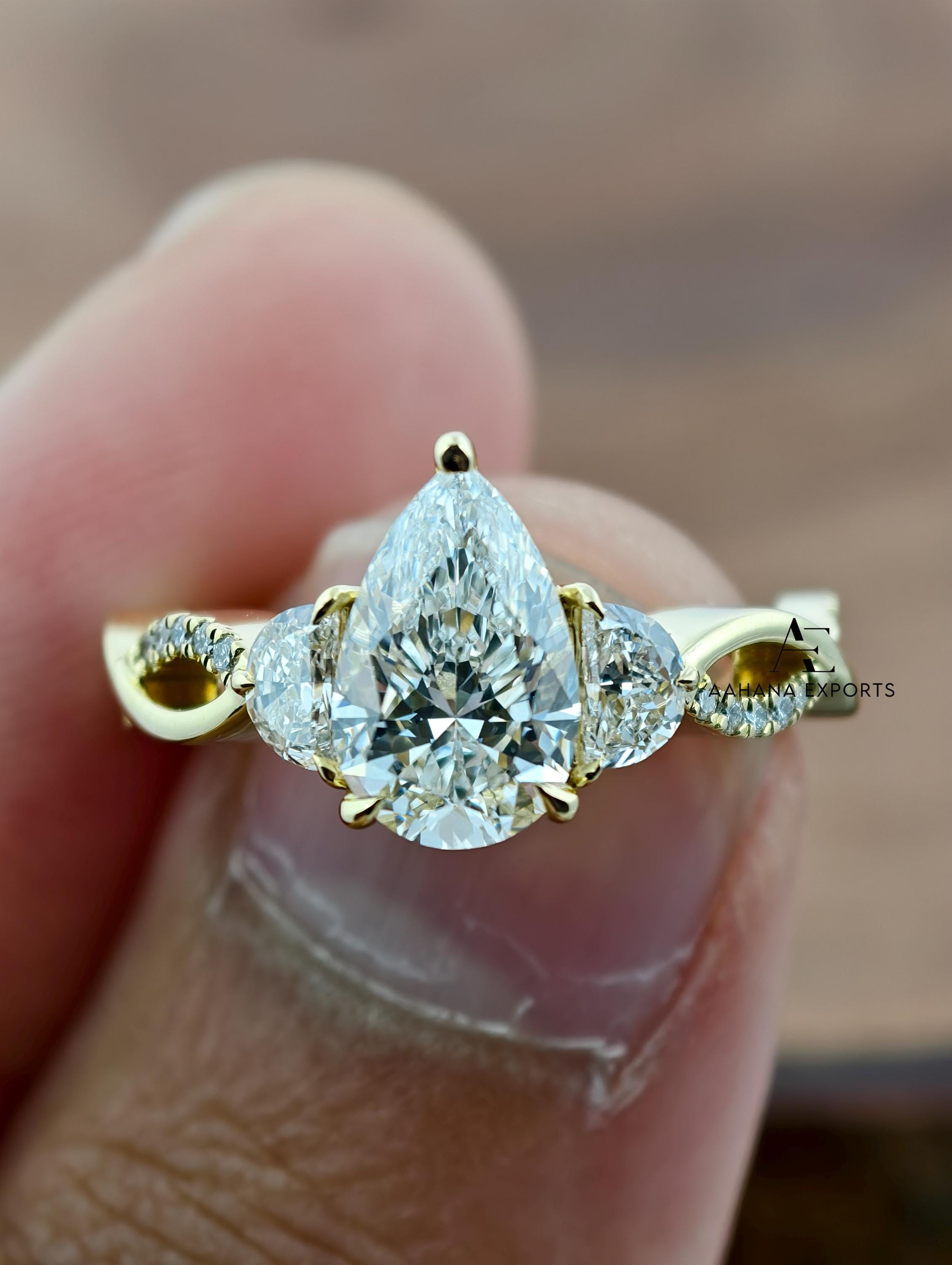 Three Stone Ring, Unique 2.00 Carat Pear & Half Moon Cut Lab Grown Diamond Engagement Ring 14K Solid Gold Twisted Pave Wedding Band for her.